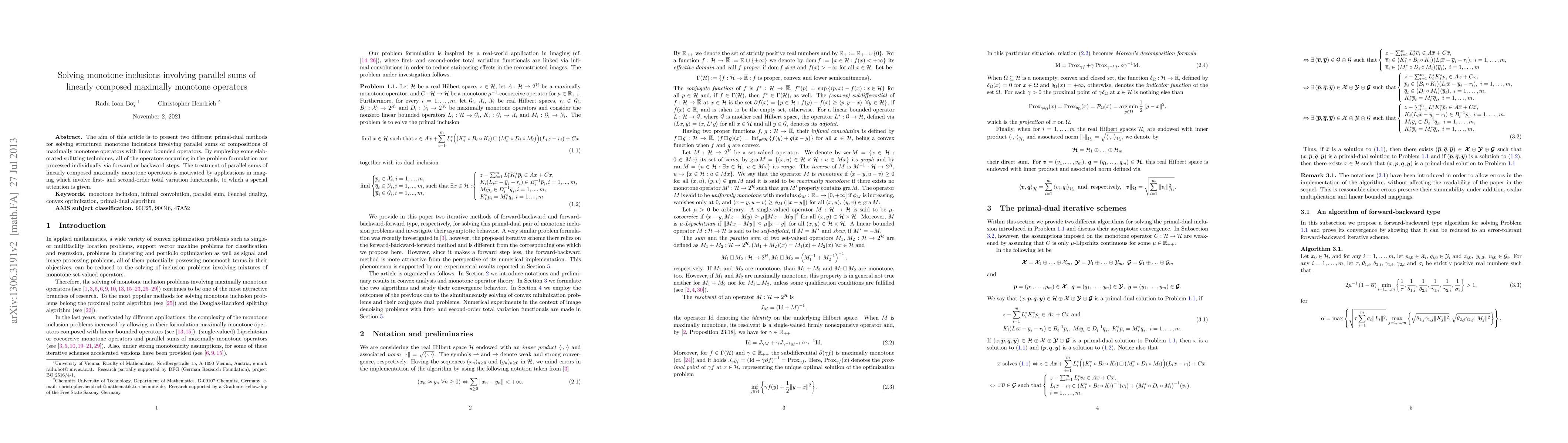 This paper introduces two primal-dual methods for solving structured monotone inclusions involving parallel sums of maximally monotone operators composed with linear operators. The methods utilize advanced splitting techniques to handle each operator individually, with a focus on applications in imaging involving total variation functionals.