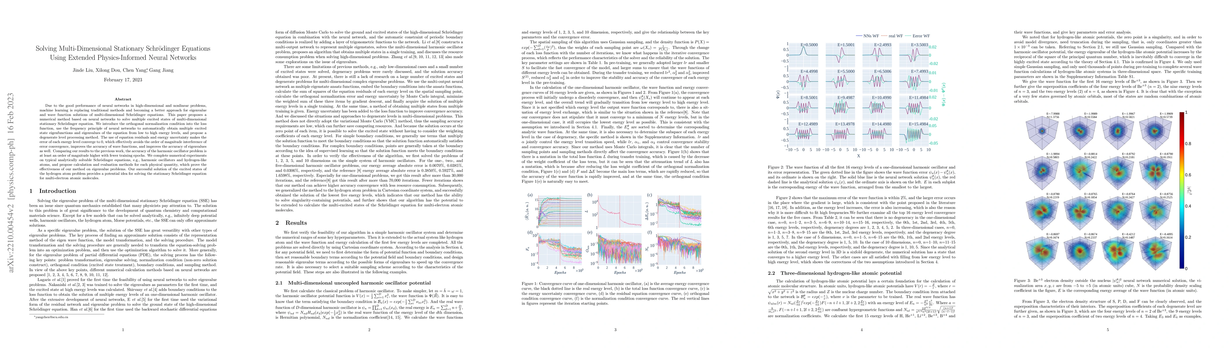 This paper proposes a neural network-based method, EPINNs, to solve multi-dimensional Schrödinger equations, achieving higher accuracy for eigenvalue and wave function solutions compared to traditional methods. The method incorporates orthogonal normalization and a degenerate level processing technique to improve convergence and accuracy.