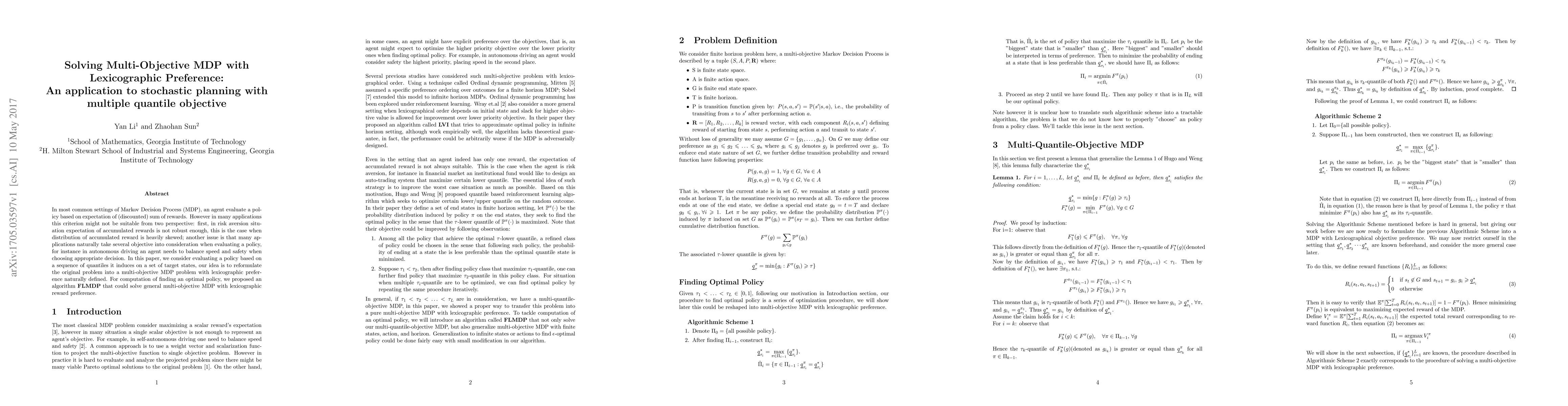 This paper proposes a method to solve multi-objective Markov Decision Processes (MDP) using lexicographic preferences, addressing risk aversion and the need to balance multiple objectives like speed and safety. The FLMDP algorithm is introduced to compute optimal policies based on a sequence of quantile objectives.