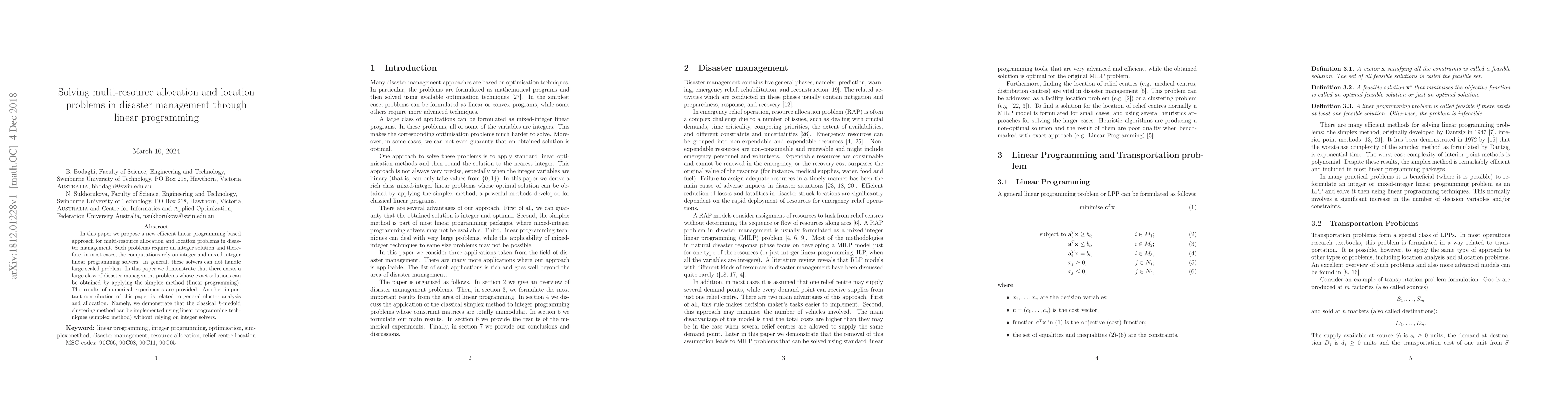 This paper introduces a linear programming approach for solving multi-resource allocation and location problems in disaster management, demonstrating that the simplex method can efficiently handle large-scale problems typically solved by integer programming. It also shows that the $k$-medoid clustering method can be implemented via linear programming without integer solvers.