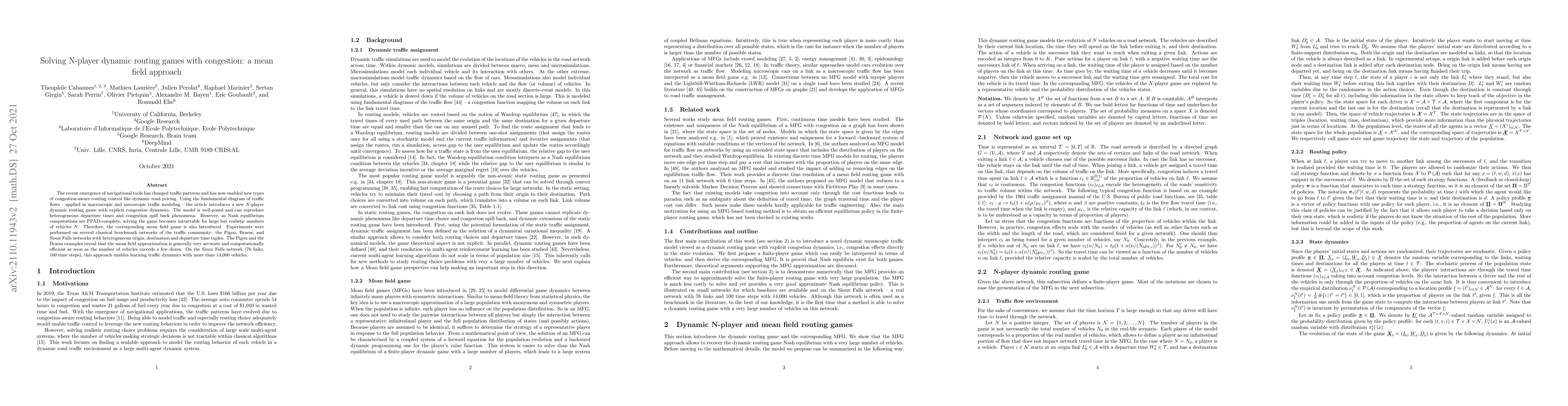 The recent emergence of navigational tools has changed traffic patterns and has now enabled new types of congestion-aware routing control like dynamic road pricing. Using the fundamental diagram of traffic flows - applied in macroscopic and mesoscopic traffic modeling - the article introduces a new N-player dynamic routing game with explicit congestion dynamics. The model is well-posed and can reproduce heterogeneous departure times and congestion spill back phenomena. However, as Nash equilibrium computations are PPAD-complete, solving the game becomes intractable for large but realistic numbers of vehicles N. Therefore, the corresponding mean field game is also introduced. Experiments were performed on several classical benchmark networks of the traffic community: the Pigou, Braess, and Sioux Falls networks with heterogeneous origin, destination and departure time tuples. The Pigou and the Braess examples reveal that the mean field approximation is generally very accurate and computationally efficient as soon as the number of vehicles exceeds a few dozen. On the Sioux Falls network (76 links, 100 time steps), this approach enables learning traffic dynamics with more than 14,000 vehicles.