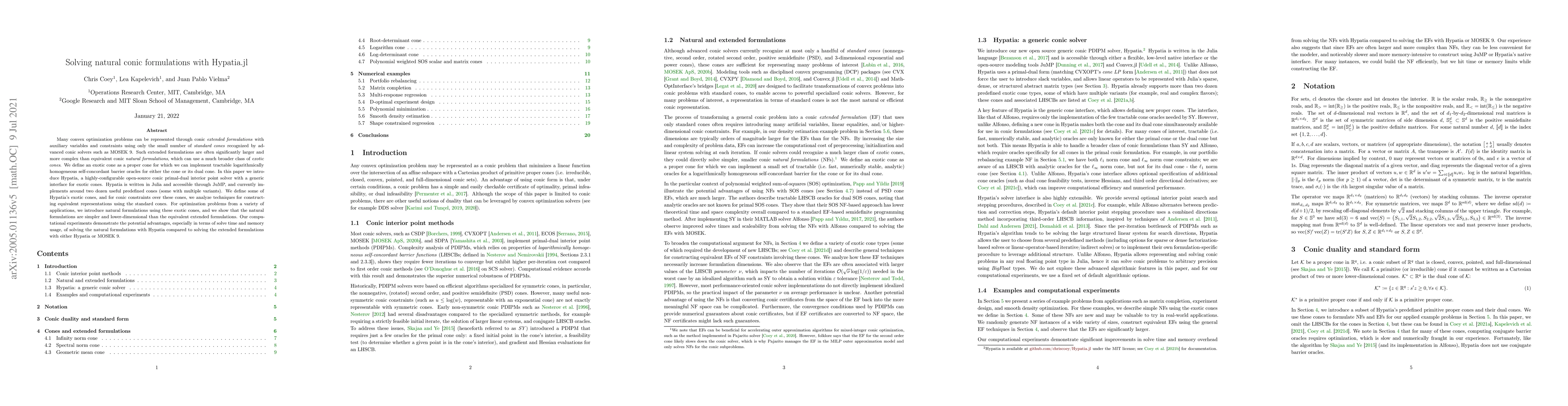 This paper introduces Hypatia.jl, an open-source conic solver for natural formulations using exotic cones, and demonstrates its efficiency over extended formulations by comparing solve times and memory usage across various optimization problems. Hypatia's flexible interface supports a range of predefined cones and offers significant reductions in problem dimensionality.