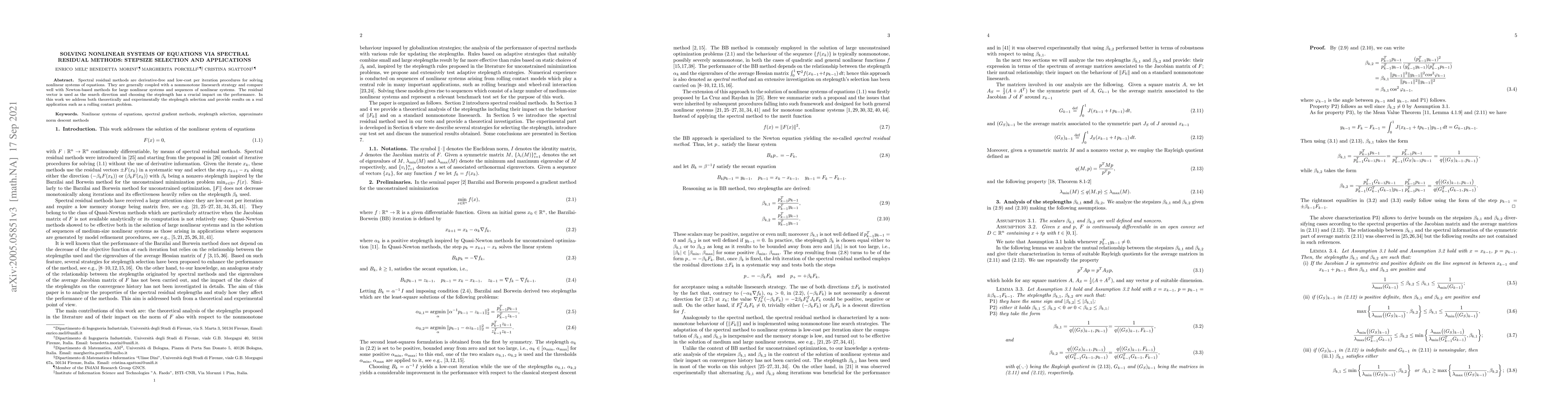 This paper presents a new method for solving nonlinear systems of equations using spectral residual methods, focusing on steplength selection and its impact on performance in real-world applications such as the rolling contact problem.