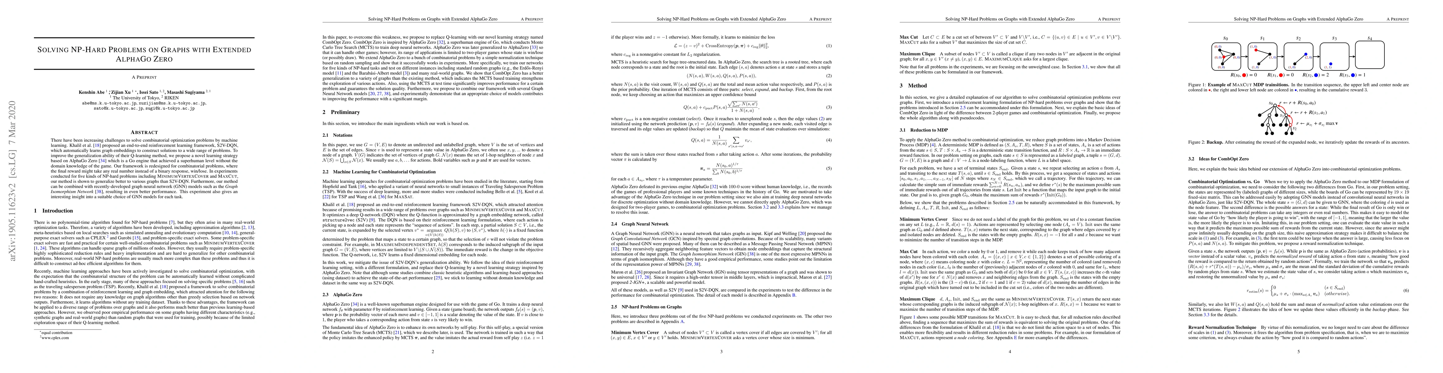 There have been increasing challenges to solve combinatorial optimization problems by machine learning. Khalil et al. proposed an end-to-end reinforcement learning framework, S2V-DQN, which automatically learns graph embeddings to construct solutions to a wide range of problems. To improve the generalization ability of their Q-learning method, we propose a novel learning strategy based on AlphaGo Zero which is a Go engine that achieved a superhuman level without the domain knowledge of the game. Our framework is redesigned for combinatorial problems, where the final reward might take any real number instead of a binary response, win/lose. In experiments conducted for five kinds of NP-hard problems including {\sc MinimumVertexCover} and {\sc MaxCut}, our method is shown to generalize better to various graphs than S2V-DQN. Furthermore, our method can be combined with recently-developed graph neural network (GNN) models such as the \emph{Graph Isomorphism Network}, resulting in even better performance. This experiment also gives an interesting insight into a suitable choice of GNN models for each task.