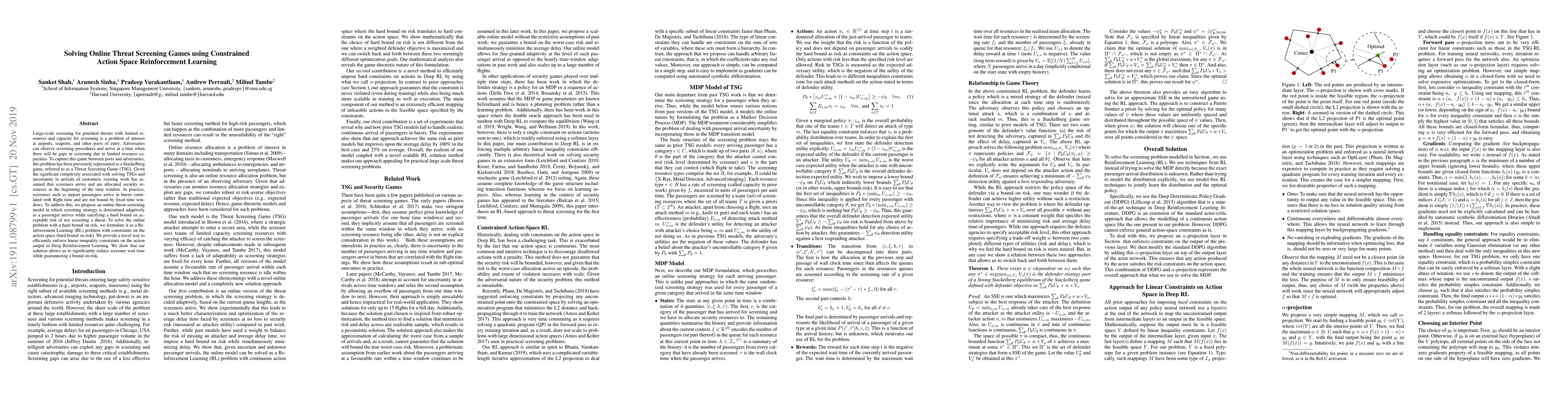 Large-scale screening for potential threats with limited resources and capacity for screening is a problem of interest at airports, seaports, and other ports of entry. Adversaries can observe screening procedures and arrive at a time when there will be gaps in screening due to limited resource capacities. To capture this game between ports and adversaries, this problem has been previously represented as a Stackelberg game, referred to as a Threat Screening Game (TSG). Given the significant complexity associated with solving TSGs and uncertainty in arrivals of customers, existing work has assumed that screenees arrive and are allocated security resources at the beginning of the time window. In practice, screenees such as airport passengers arrive in bursts correlated with flight time and are not bound by fixed time windows. To address this, we propose an online threat screening model in which screening strategy is determined adaptively as a passenger arrives while satisfying a hard bound on acceptable risk of not screening a threat. To solve the online problem with a hard bound on risk, we formulate it as a Reinforcement Learning (RL) problem with constraints on the action space (hard bound on risk). We provide a novel way to efficiently enforce linear inequality constraints on the action output in Deep Reinforcement Learning. We show that our solution allows us to significantly reduce screenee wait time while guaranteeing a bound on risk.
