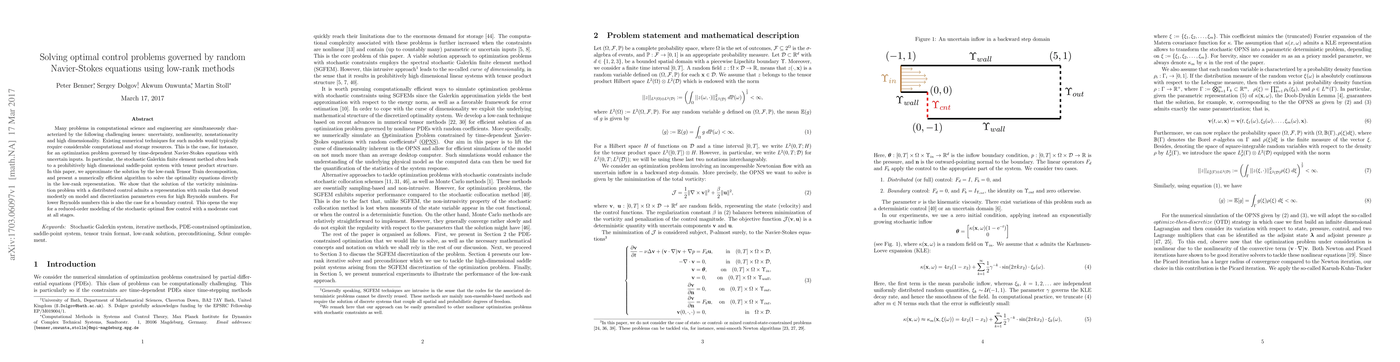 Many problems in computational science and engineering are simultaneously characterized by the following challenging issues: uncertainty, nonlinearity, nonstationarity and high dimensionality. Existing numerical techniques for such models would typically require considerable computational and storage resources. This is the case, for instance, for an optimization problem governed by time-dependent Navier-Stokes equations with uncertain inputs. In particular, the stochastic Galerkin finite element method often leads to a prohibitively high dimensional saddle-point system with tensor product structure. In this paper, we approximate the solution by the low-rank Tensor Train decomposition, and present a numerically efficient algorithm to solve the optimality equations directly in the low-rank representation. We show that the solution of the vorticity minimization problem with a distributed control admits a representation with ranks that depend modestly on model and discretization parameters even for high Reynolds numbers. For lower Reynolds numbers this is also the case for a boundary control. This opens the way for a reduced-order modeling of the stochastic optimal flow control with a moderate cost at all stages.