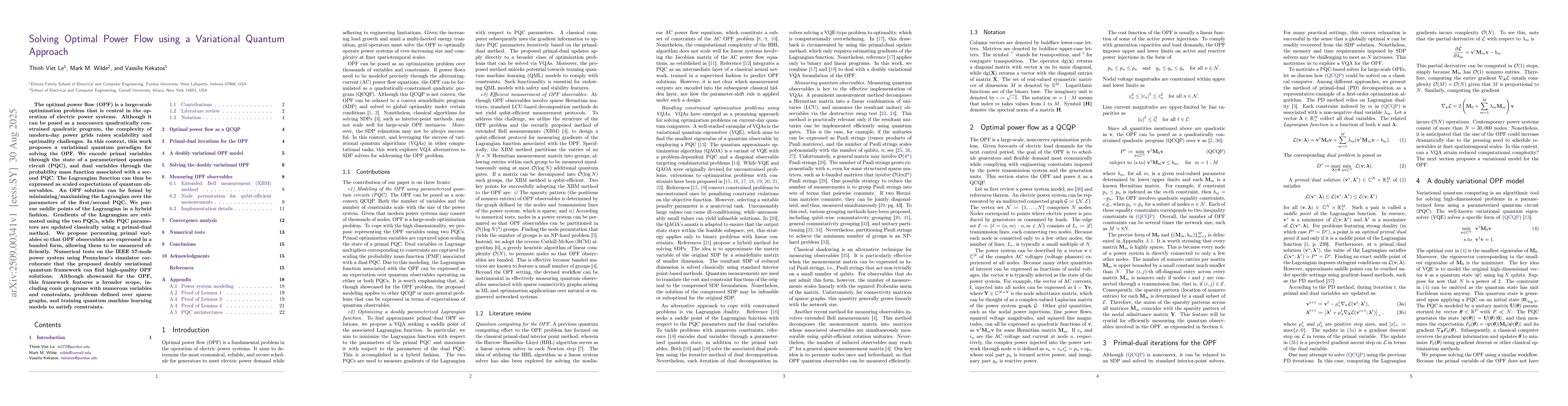 The optimal power flow (OPF) is a large-scale optimization problem that is central in the operation of electric power systems. Although it can be posed as a nonconvex quadratically constrained quadratic program, the complexity of modern-day power grids raises scalability and optimality challenges. In this context, this work proposes a variational quantum paradigm for solving the OPF. We encode primal variables through the state of a parameterized quantum circuit (PQC), and dual variables through the probability mass function associated with a second PQC. The Lagrangian function can thus be expressed as scaled expectations of quantum observables. An OPF solution can be found by minimizing/maximizing the Lagrangian over the parameters of the first/second PQC. We pursue saddle points of the Lagrangian in a hybrid fashion. Gradients of the Lagrangian are estimated using the two PQCs, while PQC parameters are updated classically using a primal-dual method. We propose permuting primal variables so that OPF observables are expressed in a banded form, allowing them to be measured efficiently. Numerical tests on the IEEE 57-node power system using Pennylane's simulator corroborate that the proposed doubly variational quantum framework can find high-quality OPF solutions. Although showcased for the OPF, this framework features a broader scope, including conic programs with numerous variables and constraints, problems defined over sparse graphs, and training quantum machine learning models to satisfy constraints.