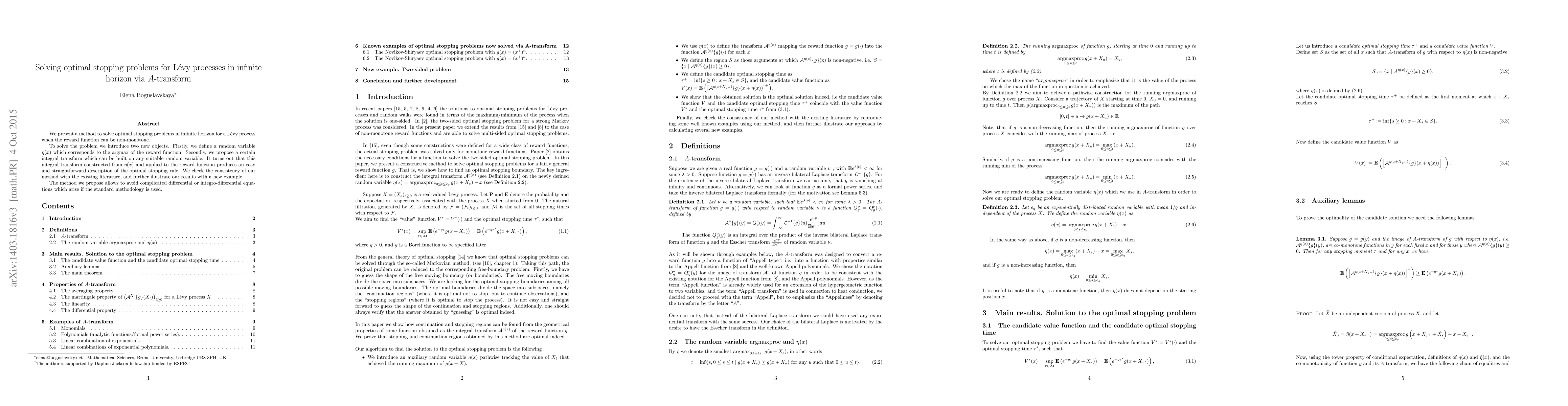 This paper introduces a novel method to solve optimal stopping problems for Lévy processes in infinite horizons, even when the reward function is non-monotone. The method utilizes an $A$-transform based on a new random variable $\eta(x)$ and avoids complex differential or integro-differential equations typically encountered.