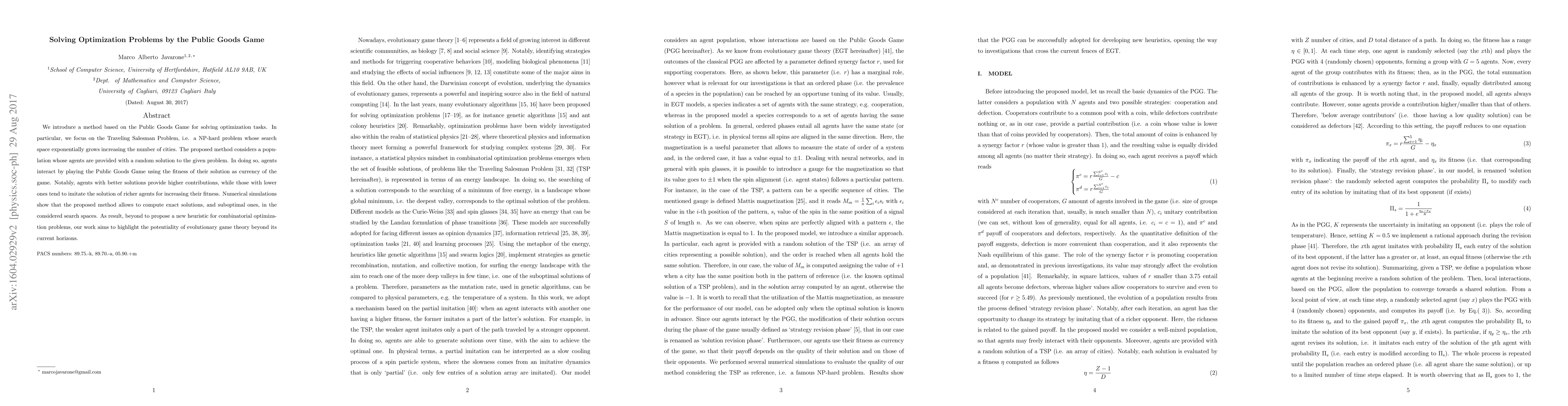 We introduce a method based on the Public Goods Game for solving optimization tasks. In particular, we focus on the Traveling Salesman Problem, i.e. a NP-hard problem whose search space exponentially grows increasing the number of cities. The proposed method considers a population whose agents are provided with a random solution to the given problem. In doing so, agents interact by playing the Public Goods Game using the fitness of their solution as currency of the game. Notably, agents with better solutions provide higher contributions, while those with lower ones tend to imitate the solution of richer agents for increasing their fitness. Numerical simulations show that the proposed method allows to compute exact solutions, and suboptimal ones, in the considered search spaces. As result, beyond to propose a new heuristic for combinatorial optimization problems, our work aims to highlight the potentiality of evolutionary game theory beyond its current horizons.