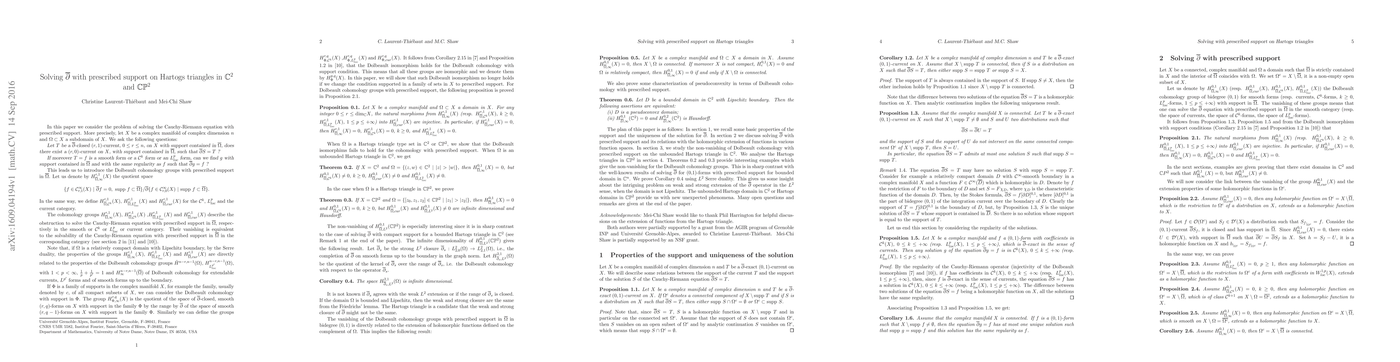 This paper investigates the solvability of the $\overline\partial$ equation with prescribed support in $\mathbb C^2$ and $\mathbb C\mathbb P^2$, revealing new phenomena in Hartogs triangles and domains. It demonstrates that the Dolbeault isomorphism does not hold for the Dolbeault cohomology with prescribed support.