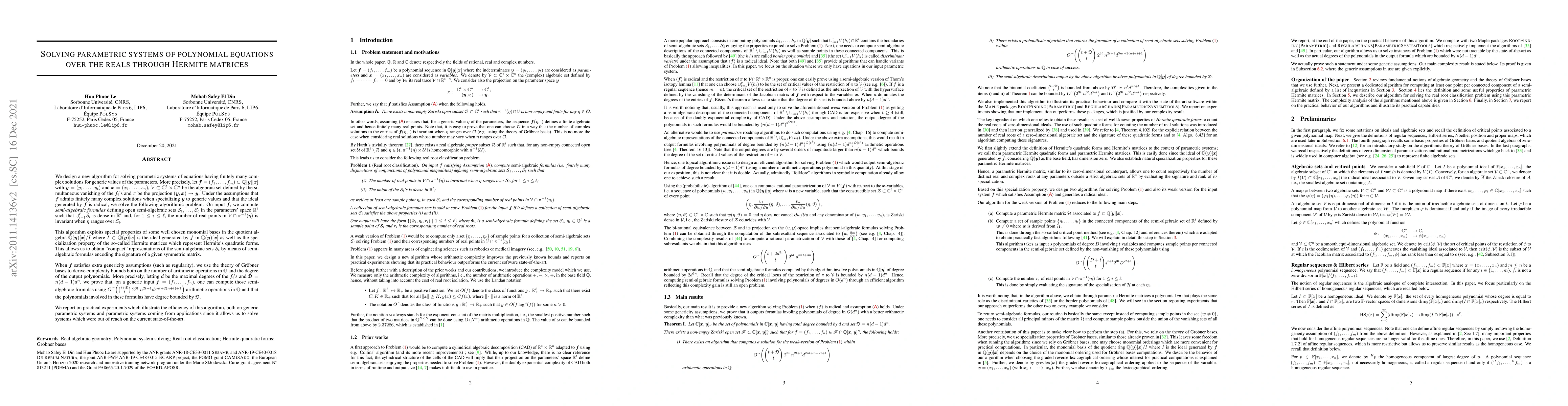 We design a new algorithm for solving parametric systems having finitely many complex solutions for generic values of the parameters. More precisely, let $f = (f_1, \ldots, f_m)\subset \mathbb{Q}[y][x]$ with $y = (y_1, \ldots, y_t)$ and $x = (x_1, \ldots, x_n)$, $V\subset \mathbb{C}^{t+n}$ be the algebraic set defined by $f$ and $\pi$ be the projection $(y, x) \to y$. Under the assumptions that $f$ admits finitely many complex roots for generic values of $y$ and that the ideal generated by $f$ is radical, we solve the following problem. On input $f$, we compute semi-algebraic formulas defining semi-algebraic subsets $S_1, \ldots, S_l$ of the $y$-space such that $\cup_{i=1}^l S_i$ is dense in $\mathbb{R}^t$ and the number of real points in $V\cap \pi^{-1}(\eta)$ is invariant when $\eta$ varies over each $S_i$. This algorithm exploits properties of some well chosen monomial bases in the algebra $\mathbb{Q}(y)[x]/I$ where $I$ is the ideal generated by $f$ in $\mathbb{Q}(y)[x]$ and the specialization property of the so-called Hermite matrices. This allows us to obtain compact representations of the sets $S_i$ by means of semi-algebraic formulas encoding the signature of a symmetric matrix. When $f$ satisfies extra genericity assumptions, we derive complexity bounds on the number of arithmetic operations in $\mathbb{Q}$ and the degree of the output polynomials. Let $d$ be the maximal degree of the $f_i$'s and $D = n(d-1)d^n$, we prove that, on a generic $f=(f_1,\ldots,f_n)$, one can compute those semi-algebraic formulas with $O^~( \binom{t+D}{t}2^{3t}n^{2t+1} d^{3nt+2(n+t)+1})$ operations in $\mathbb{Q}$ and that the polynomials involved have degree bounded by $D$. We report on practical experiments which illustrate the efficiency of our algorithm on generic systems and systems from applications. It allows us to solve problems which are out of reach of the state-of-the-art.