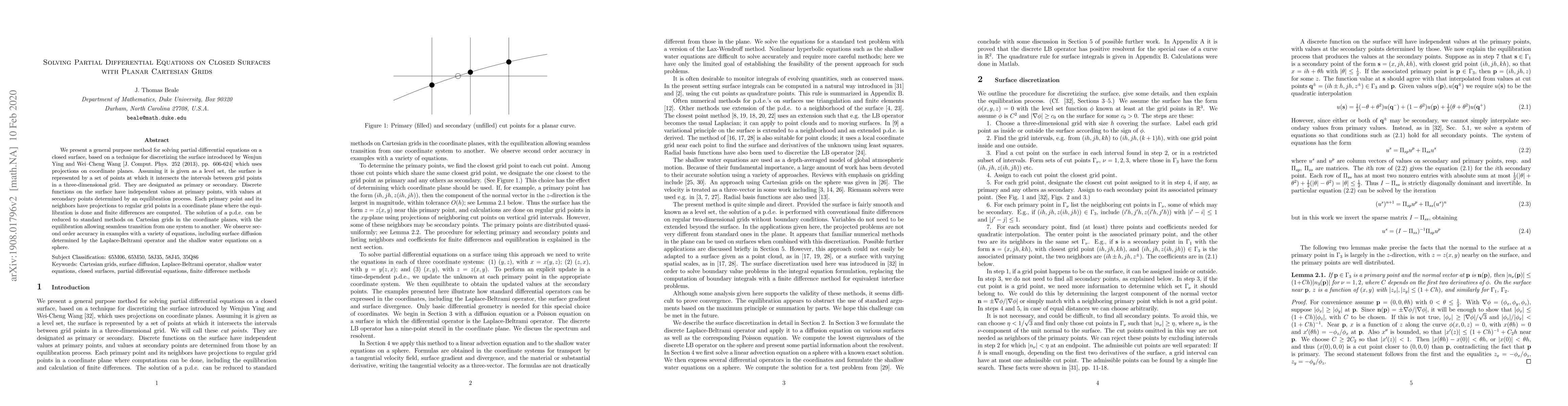 This paper presents a method for solving partial differential equations on closed surfaces using planar Cartesian grids, projecting surface points onto coordinate planes for equilibration and finite differences, achieving second order accuracy in various applications.