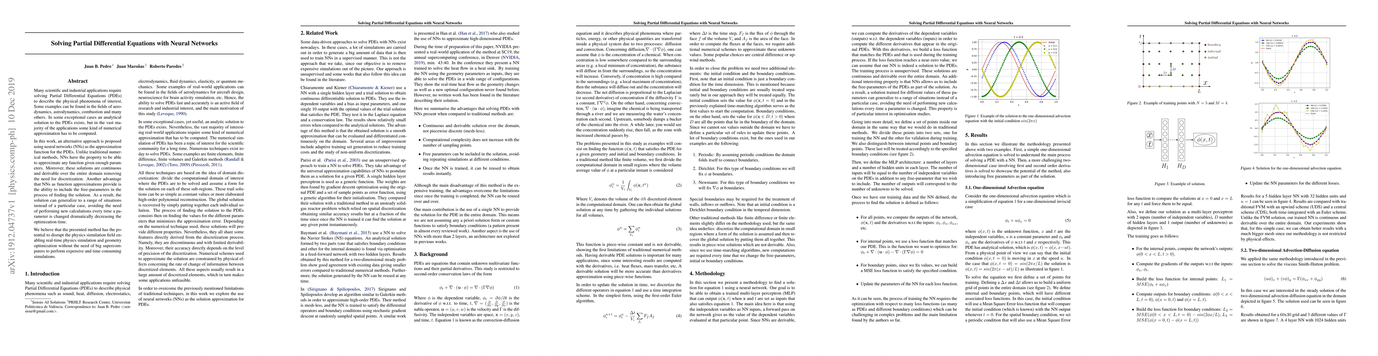 Many scientific and industrial applications require solving Partial Differential Equations (PDEs) to describe the physical phenomena of interest. Some examples can be found in the fields of aerodynamics, astrodynamics, combustion and many others. In some exceptional cases an analytical solution to the PDEs exists, but in the vast majority of the applications some kind of numerical approximation has to be computed. In this work, an alternative approach is proposed using neural networks (NNs) as the approximation function for the PDEs. Unlike traditional numerical methods, NNs have the property to be able to approximate any function given enough parameters. Moreover, these solutions are continuous and derivable over the entire domain removing the need for discretization. Another advantage that NNs as function approximations provide is the ability to include the free-parameters in the process of finding the solution. As a result, the solution can generalize to a range of situations instead of a particular case, avoiding the need of performing new calculations every time a parameter is changed dramatically decreasing the optimization time. We believe that the presented method has the potential to disrupt the physics simulation field enabling real-time physics simulation and geometry optimization without the need of big supercomputers to perform expensive and time consuming simulations