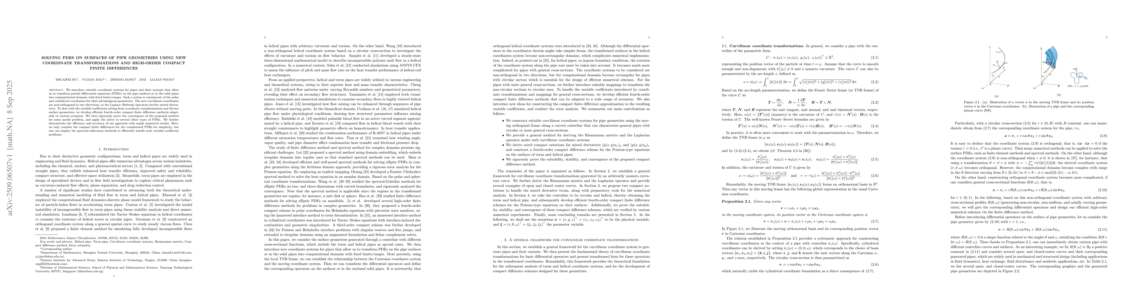 We introduce suitable coordinate systems for pipes and their variants that allow us to transform partial differential equations (PDEs) on the pipe surfaces or in the solid pipes into computational domains with fixed limits/ranges. Such a notion is reminiscent of the polar and cylindrical coordinates for their advantageous geometries. The new curvilinear coordinates are non-orthogonal in two directions, so the Laplace--Beltrami operators involve mixed derivatives. To deal with the variable coefficients arising from coordinate transformations and diverse surface geometries, we develop efficient fourth-order compact finite difference methods adaptable to various scenarios. We then rigorously prove the convergence of the proposed method for some model problem, and apply the solver to several other types of PDEs. We further demonstrate the efficiency and accuracy of our approach with ample numerical results. Here, we only consider the compact finite differences for the transformed PDEs for simplicity, but one can employ the spectral-collocation methods to efficiently handle such variable coefficient problems.