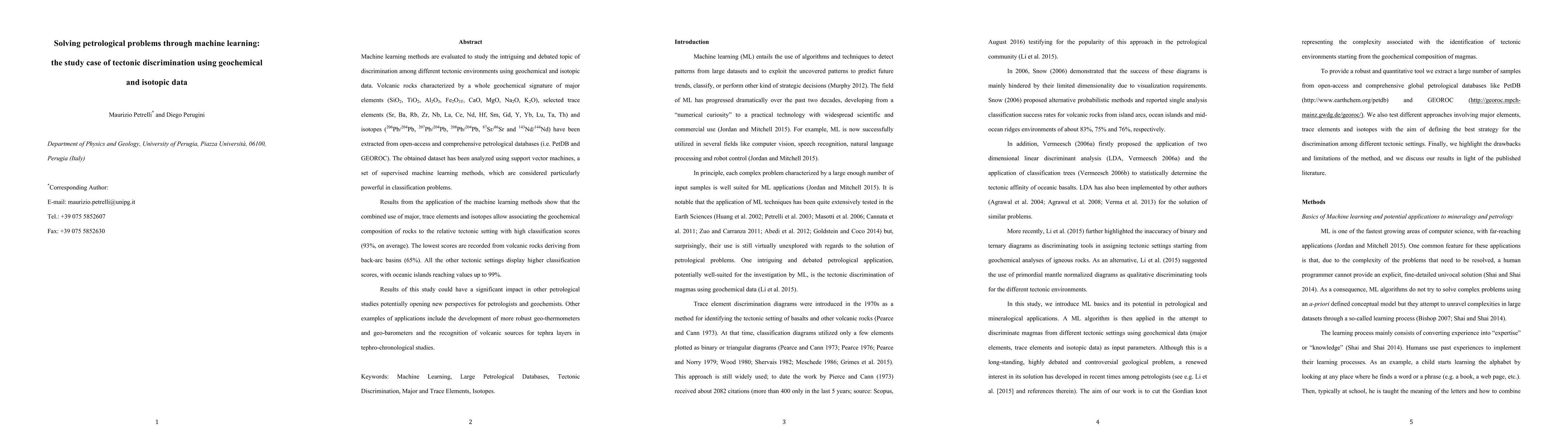 This research applies machine learning, specifically support vector machines, to classify volcanic rocks based on geochemical and isotopic data, achieving high accuracy (93% on average) in tectonic discrimination. The study highlights the potential of machine learning in advancing petrological studies, including the development of robust geo-thermometers and the identification of volcanic sources.