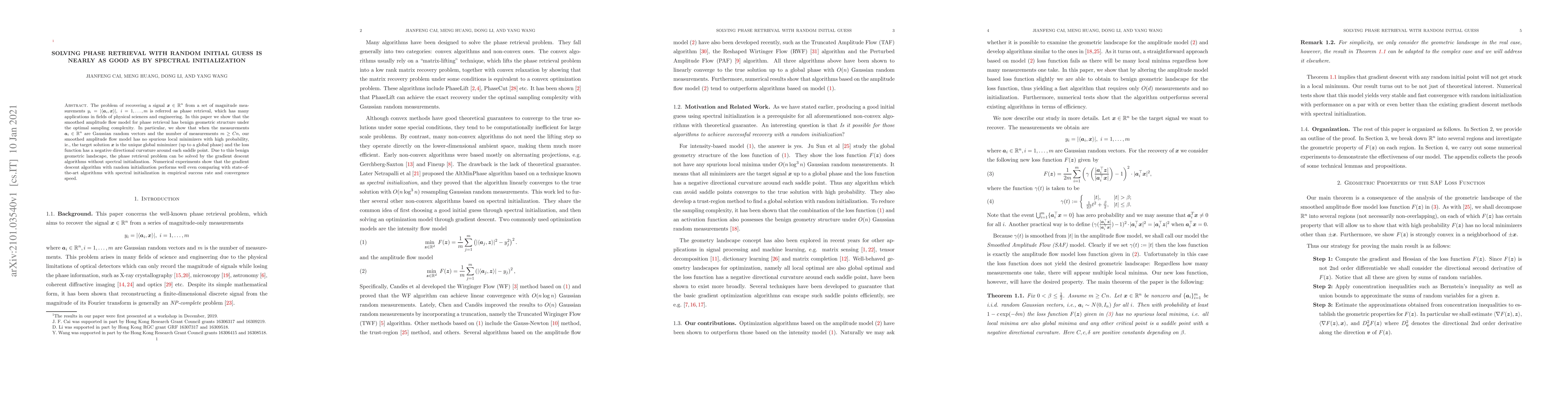 This paper demonstrates that gradient descent with random initialization can nearly match the performance of state-of-the-art algorithms with spectral initialization for solving phase retrieval problems. The authors show that the smoothed amplitude flow model exhibits a benign geometric structure under optimal sampling conditions, leading to unique global solutions.