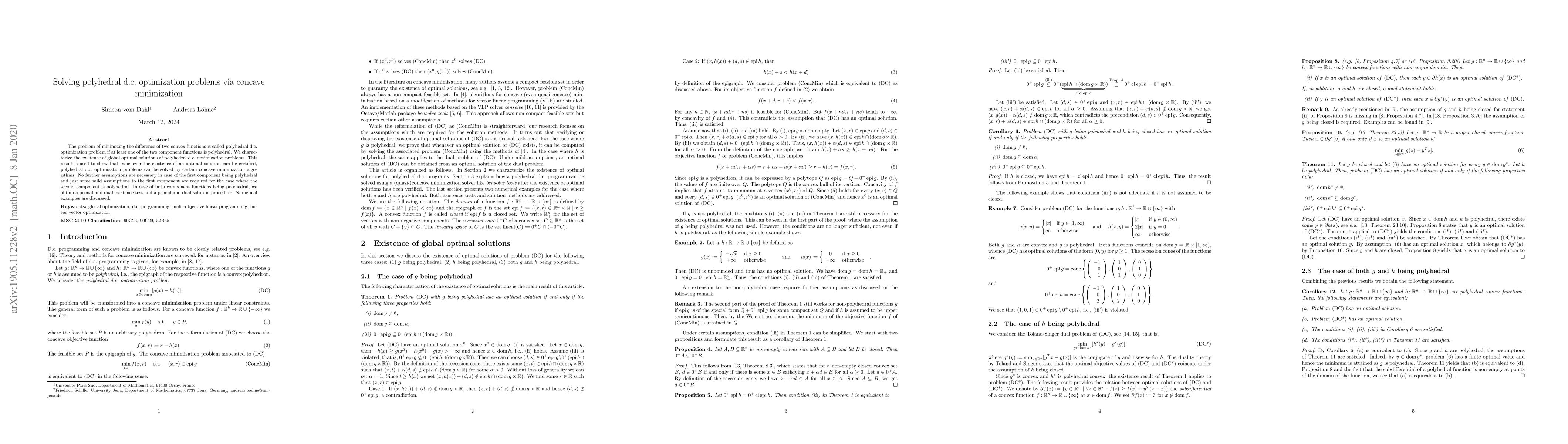 The problem of minimizing the difference of two convex functions is called polyhedral d.c. optimization problem if at least one of the two component functions is polyhedral. We characterize the existence of global optimal solutions of polyhedral d.c. optimization problems. This result is used to show that, whenever the existence of an optimal solution can be certified, polyhedral d.c. optimization problems can be solved by certain concave minimization algorithms. No further assumptions are necessary in case of the first component being polyhedral and just some mild assumptions to the first component are required for the case where the second component is polyhedral. In case of both component functions being polyhedral, we obtain a primal and dual existence test and a primal and dual solution procedure. Numerical examples are discussed.