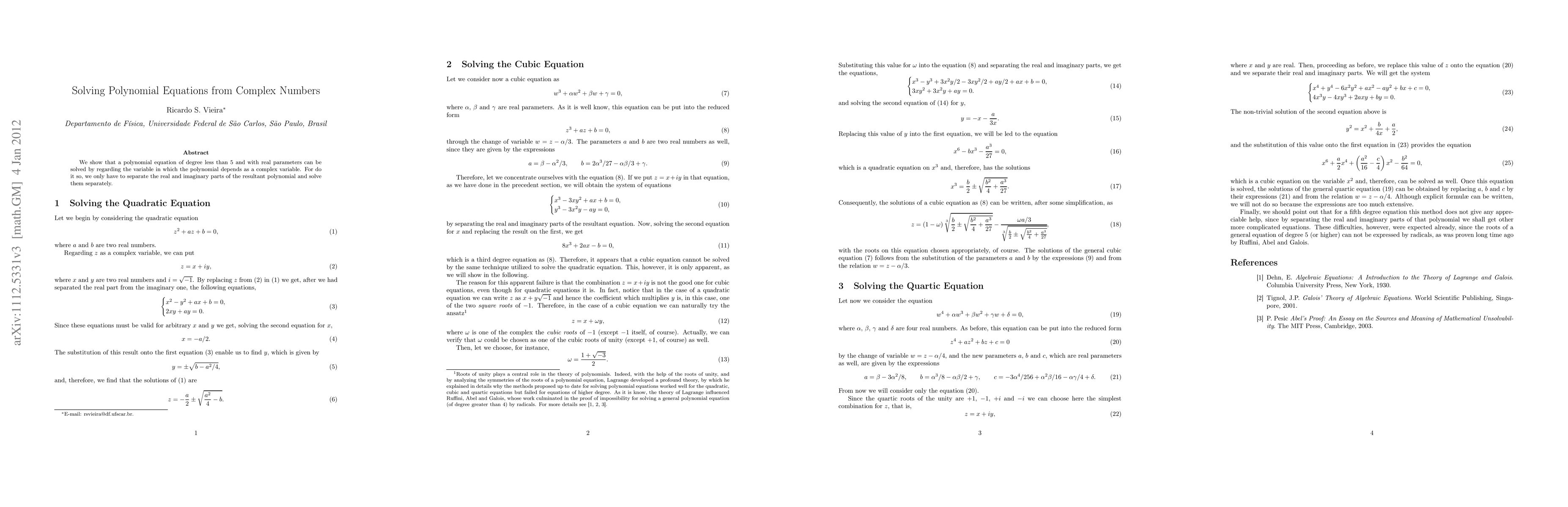 We show that a polynomial equation of degree less than 5 and with real parameters can be solved by regarding the variable in which the polynomial depends as a complex variable. For do it so, we only have to separate the real and imaginary parts of the resultant polynomial and solve them separately.