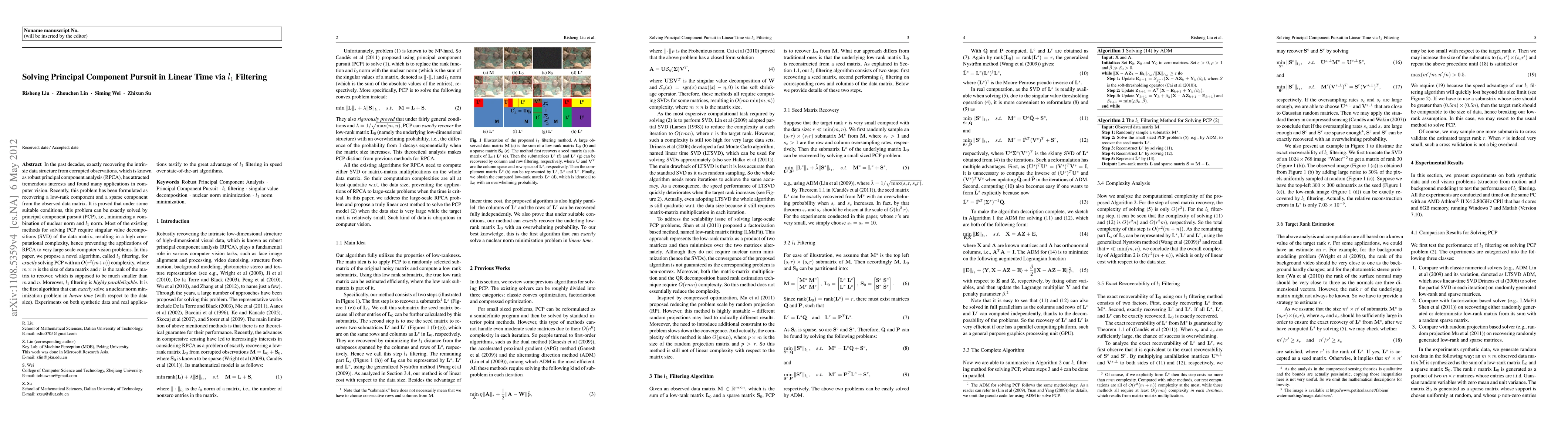 In the past decades, exactly recovering the intrinsic data structure from corrupted observations, which is known as robust principal component analysis (RPCA), has attracted tremendous interests and found many applications in computer vision. Recently, this problem has been formulated as recovering a low-rank component and a sparse component from the observed data matrix. It is proved that under some suitable conditions, this problem can be exactly solved by principal component pursuit (PCP), i.e., minimizing a combination of nuclear norm and $l_1$ norm. Most of the existing methods for solving PCP require singular value decompositions (SVD) of the data matrix, resulting in a high computational complexity, hence preventing the applications of RPCA to very large scale computer vision problems. In this paper, we propose a novel algorithm, called $l_1$ filtering, for \emph{exactly} solving PCP with an $O(r^2(m+n))$ complexity, where $m\times n$ is the size of data matrix and $r$ is the rank of the matrix to recover, which is supposed to be much smaller than $m$ and $n$. Moreover, $l_1$ filtering is \emph{highly parallelizable}. It is the first algorithm that can \emph{exactly} solve a nuclear norm minimization problem in \emph{linear time} (with respect to the data size). Experiments on both synthetic data and real applications testify to the great advantage of $l_1$ filtering in speed over state-of-the-art algorithms.