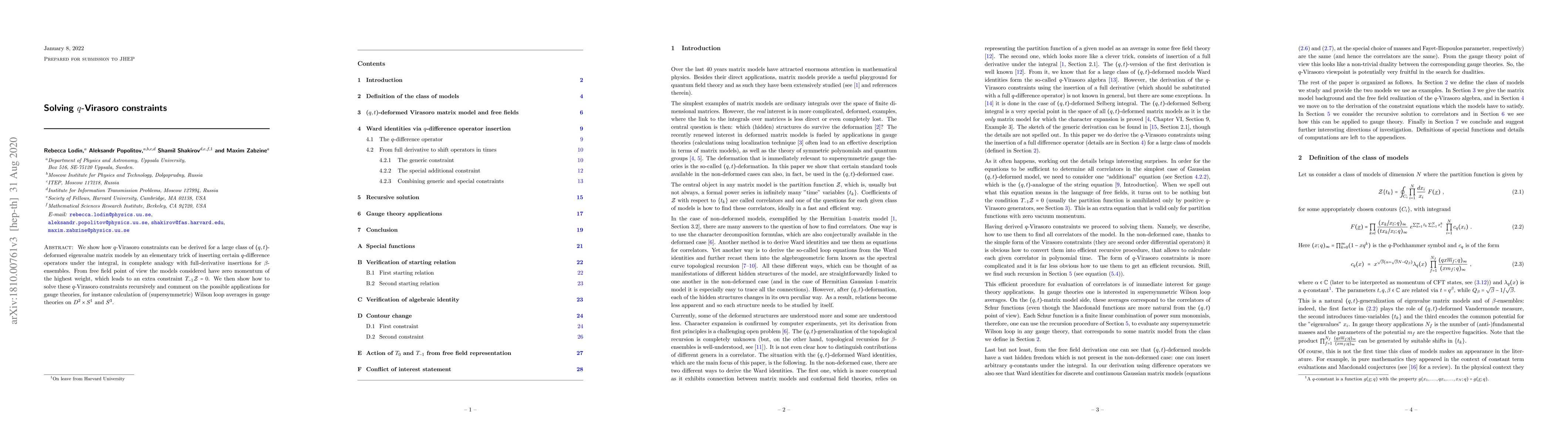 This paper derives q-Virasoro constraints for (q,t)-deformed eigenvalue matrix models using q-difference operators, showing an additional constraint T_{-1} Z = 0, and presents a recursive method to solve these constraints, with potential applications in gauge theory calculations like Wilson loop averages.