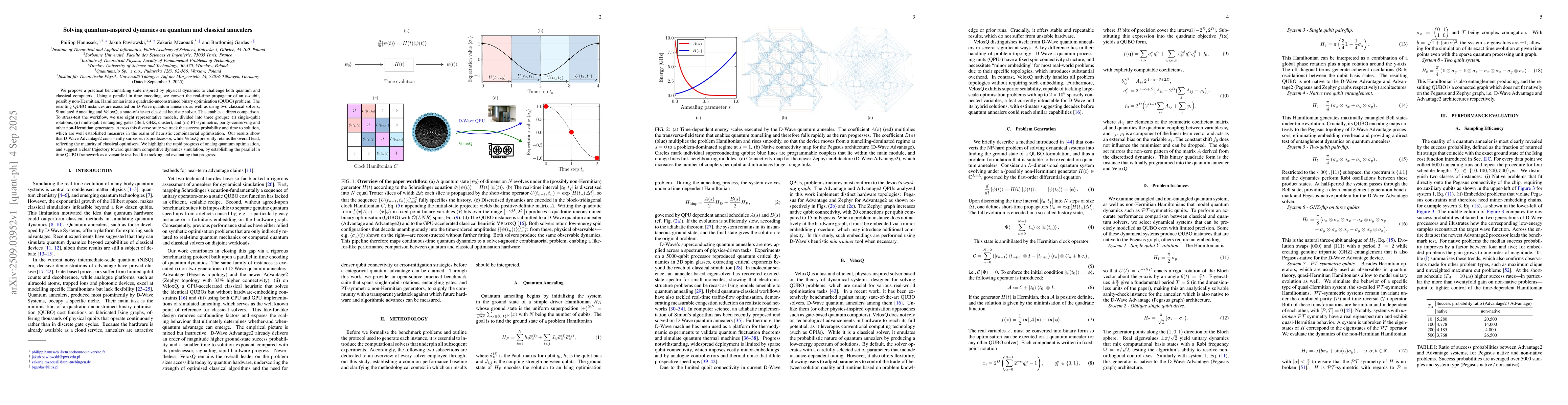 We propose a practical benchmarking suite inspired by physical dynamics to challenge both quantum and classical computers. Using a parallel in time encoding, we convert the real-time propagator of an $n$-qubit, possibly non-Hermitian, Hamiltonian into a quadratic-unconstrained binary optimisation (QUBO) problem. The resulting QUBO instances are executed on D-Wave quantum annealers as well as using two classical solvers, Simulated Annealing and VeloxQ, a state-of-the-art classical heuristic solver. This enables a direct comparison. To stress-test the workflow, we use eight representative models, divided into three groups: (i)~single-qubit rotations, (ii)~multi-qubit entangling gates (Bell, GHZ, cluster), and (iii)~$\text{PT}$-symmetric, parity-conserving and other non-Hermitian generators. Across this diverse suite we track the success probability and time to solution, which are well established measures in the realm of heuristic combinatorial optimisation. Our results show that D-Wave Advantage2 consistently surpasses its predecessor, while VeloxQ presently retains the overall lead, reflecting the maturity of classical optimisers. We highlight the rapid progress of analog quantum optimisation, and suggest a clear trajectory toward quantum competitive dynamics simulation, by establishing the parallel in time QUBO framework as a versatile test-bed for tracking and evaluating that progress.