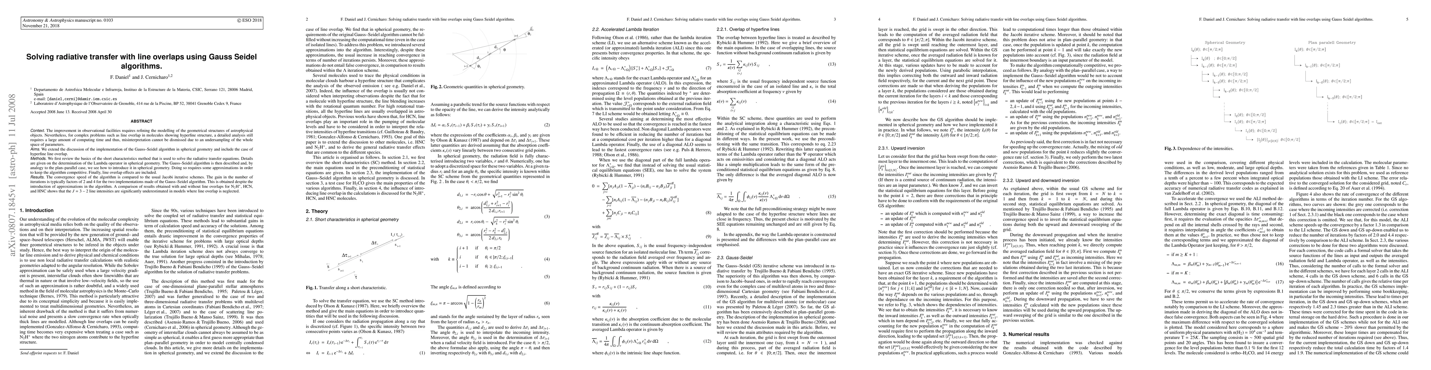 This paper discusses the implementation of Gauss-Seidel algorithms in spherical geometry for solving radiative transfer problems with line overlaps, showing significant improvements in computational efficiency over Jacobi methods. The study highlights the importance of considering line overlaps to accurately model hyperfine structures in astrophysical objects.