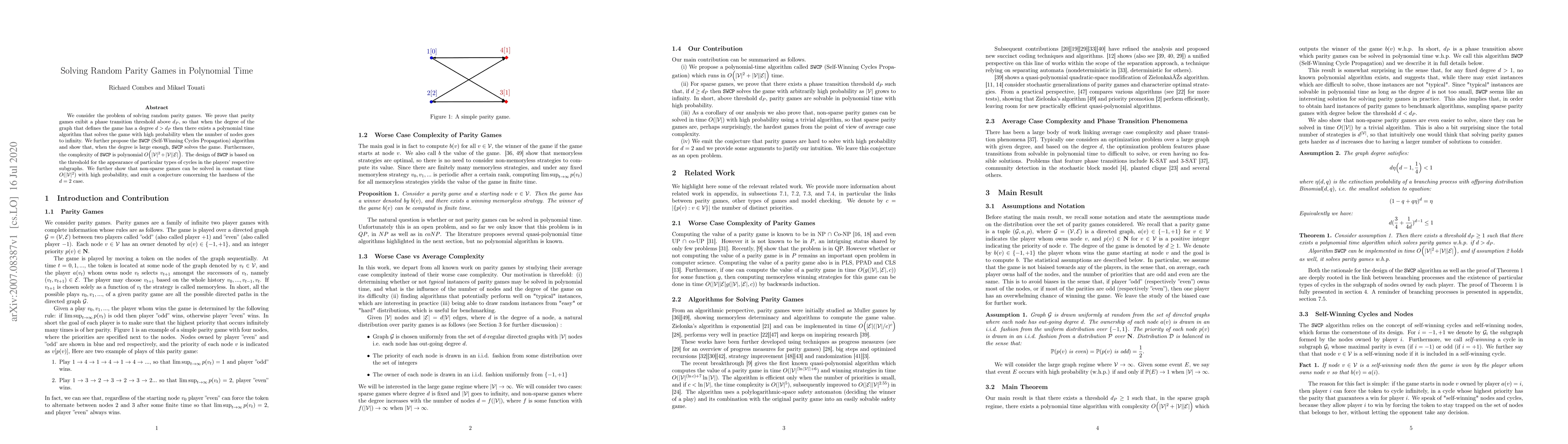 This paper demonstrates a polynomial-time algorithm for solving random parity games when the graph degree exceeds a threshold $d_P$. The proposed SWCP algorithm leverages the emergence of self-winning cycles to solve games efficiently, with a complexity of $O\Big(|{\cal V}|^2 + |{\cal V}||{\cal E}|\Big)$.