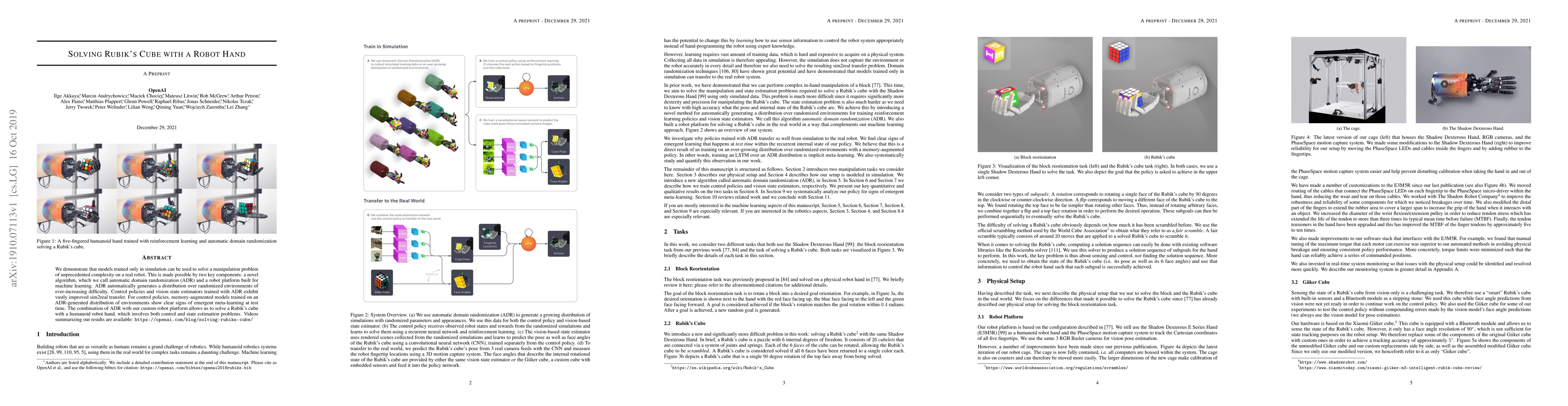 This paper presents a novel algorithm called automatic domain randomization (ADR) and a custom robot platform to solve a Rubik's cube in the real world using policies trained solely in simulation. ADR enhances sim2real transfer by generating randomized environments, leading to successful manipulation and state estimation by the robot.