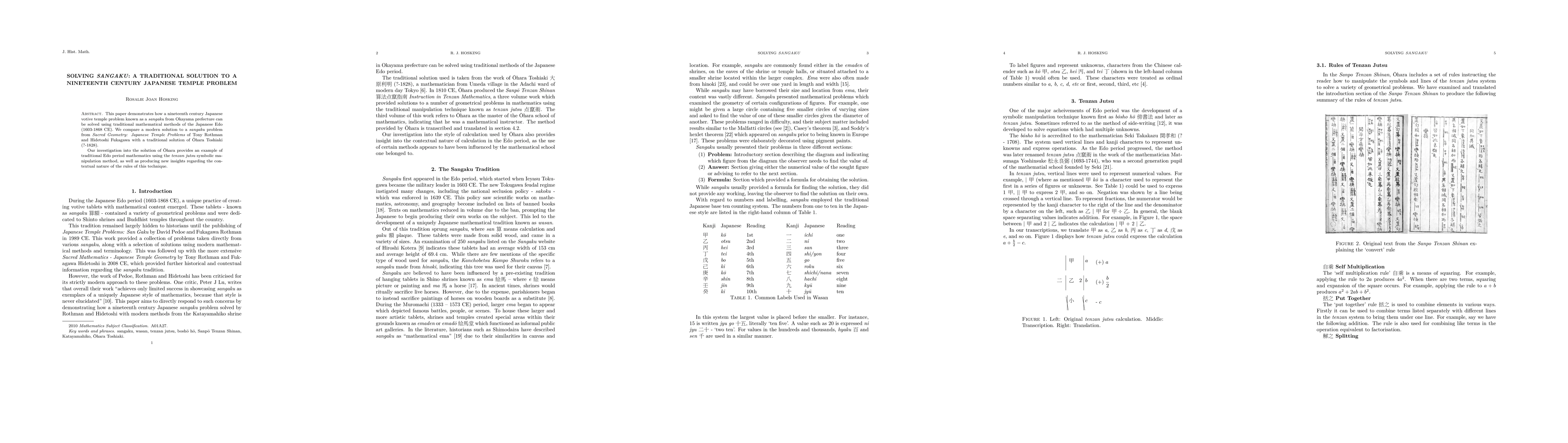 This paper demonstrates how a nineteenth century Japanese votive temple problem known as a sangaku from Okayama prefecture can be solved using traditional mathematical methods of the Japanese Edo (1603-1868 CE). We compare a modern solution to a sangaku problem from Sacred Geometry: Japanese Temple Problems of Tony Rothman and Hidetoshi Fukagawa with a traditional solution of \=Ohara Toshiaki (?-1828). Our investigation into the solution of \=Ohara provides an example of traditional Edo period mathematics using the tenzan jutsu symbolic manipulation method, as well as producing new insights regarding the contextual nature of the rules of this technique.
