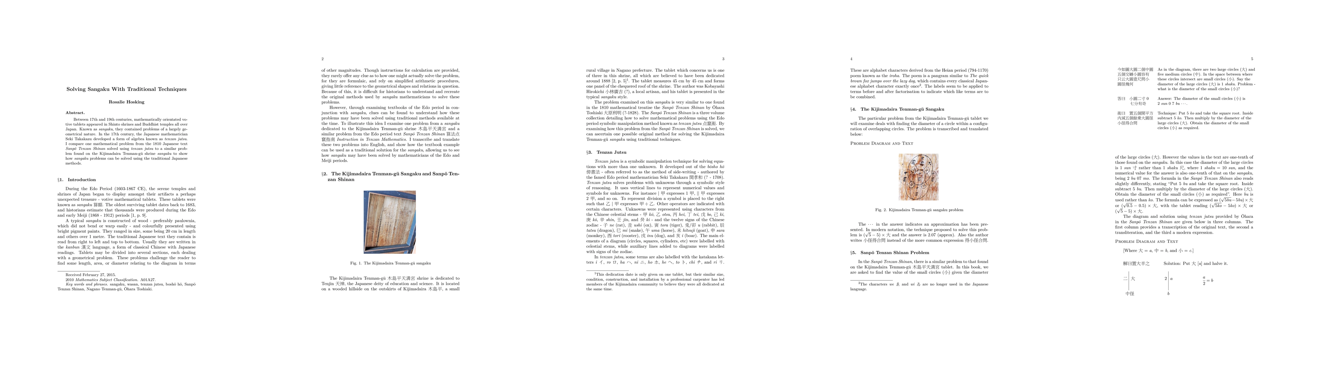 Between 17th and 19th centuries, mathematically orientated votive tablets appeared in Shinto shrines and Buddhist temples all over Japan. Known as sangaku, they contained problems of a largely geometrical nature. In the 17th century, the Japanese mathematician Seki Takakazu developed a form of algebra known as tenzan jutsu. I compare one mathematical problem from the 1810 Japanese text Sanp\=o Tenzan Shinan solved using tenzan jutsu to a similar problem found on the Kijimadaira Tenman-g\=u shrine sangaku to show how sangaku problems can be solved using the traditional Japanese methods.