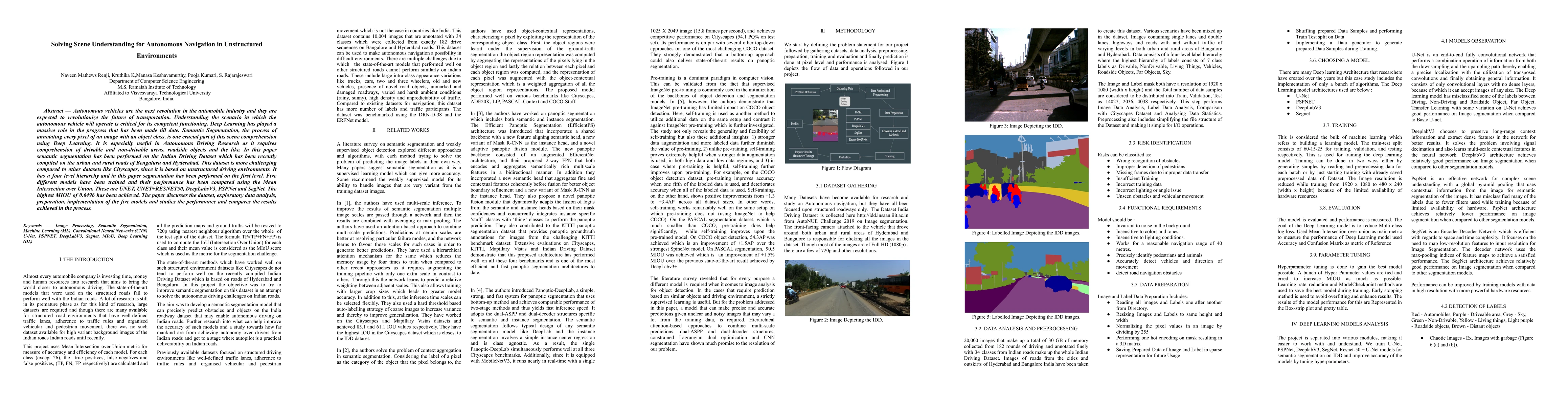 Autonomous vehicles are the next revolution in the automobile industry and they are expected to revolutionize the future of transportation. Understanding the scenario in which the autonomous vehicle will operate is critical for its competent functioning. Deep Learning has played a massive role in the progress that has been made till date. Semantic Segmentation, the process of annotating every pixel of an image with an object class, is one crucial part of this scene comprehension using Deep Learning. It is especially useful in Autonomous Driving Research as it requires comprehension of drivable and non-drivable areas, roadside objects and the like. In this paper semantic segmentation has been performed on the Indian Driving Dataset which has been recently compiled on the urban and rural roads of Bengaluru and Hyderabad. This dataset is more challenging compared to other datasets like Cityscapes, since it is based on unstructured driving environments. It has a four level hierarchy and in this paper segmentation has been performed on the first level. Five different models have been trained and their performance has been compared using the Mean Intersection over Union. These are UNET, UNET+RESNET50, DeepLabsV3, PSPNet and SegNet. The highest MIOU of 0.6496 has been achieved. The paper discusses the dataset, exploratory data analysis, preparation, implementation of the five models and studies the performance and compares the results achieved in the process.