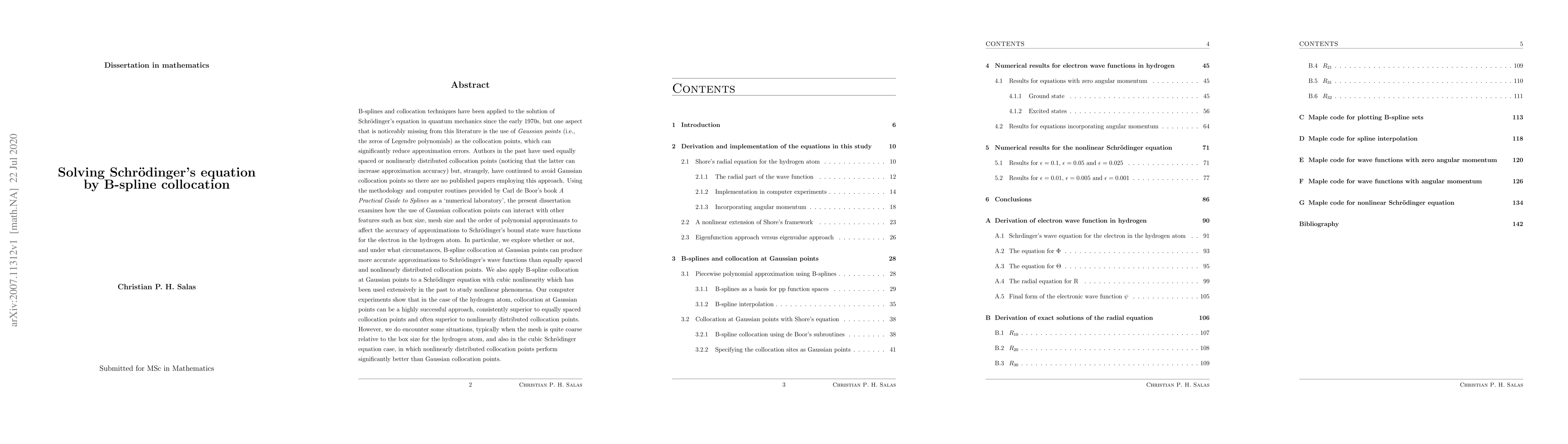 B-spline collocation techniques have been applied to Schr\"odinger's equation since the early 1970s, but one aspect that is noticeably missing from this literature is the use of Gaussian points (i.e., the zeros of Legendre polynomials) as the collocation points, which can significantly reduce approximation errors. Authors in the past have used equally spaced or nonlinearly distributed collocation points (noticing that the latter can increase approximation accuracy) but, strangely, have continued to avoid Gaussian collocation points. Using the methodology and computer routines provided by Carl de Boor's book A Practical Guide to Splines as a `numerical laboratory', the present dissertation examines how the use of Gaussian points can interact with other features such as box size, mesh size and the order of polynomial approximants to affect the accuracy of approximations to Schr\"odinger's bound state wave functions for the electron in the hydrogen atom. We explore whether or not, and under what circumstances, B-spline collocation at Gaussian points can produce more accurate approximations to Schr\"odinger's wave functions than equally spaced and nonlinearly distributed collocation points. We also apply B-spline collocation at Gaussian points to a Schr\"odinger equation with cubic nonlinearity which has been used extensively in the past to study nonlinear phenomena. Our computer experiments show that collocation at Gaussian points can be a highly successful approach for the hydrogen atom, consistently superior to equally spaced collocation points and often superior to nonlinearly distributed collocation points. However, we do encounter some situations, typically when the mesh is quite coarse relative to the box size for the hydrogen atom, and also in the cubic Schr\"odinger equation case, in which nonlinearly distributed collocation points perform better than Gaussian collocation points.