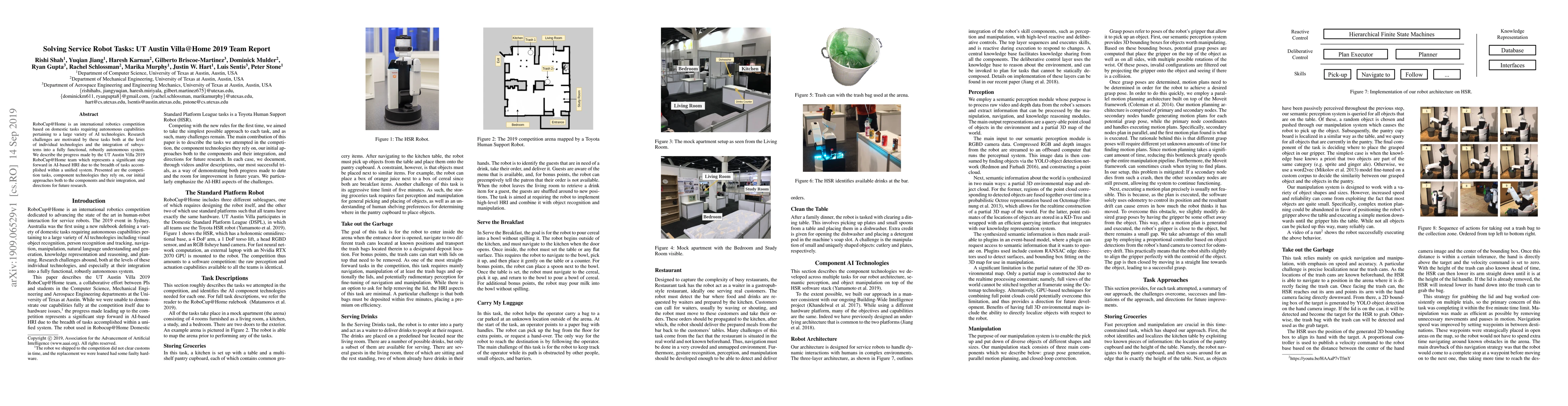RoboCup@Home is an international robotics competition based on domestic tasks requiring autonomous capabilities pertaining to a large variety of AI technologies. Research challenges are motivated by these tasks both at the level of individual technologies and the integration of subsystems into a fully functional, robustly autonomous system. We describe the progress made by the UT Austin Villa 2019 RoboCup@Home team which represents a significant step forward in AI-based HRI due to the breadth of tasks accomplished within a unified system. Presented are the competition tasks, component technologies they rely on, our initial approaches both to the components and their integration, and directions for future research.