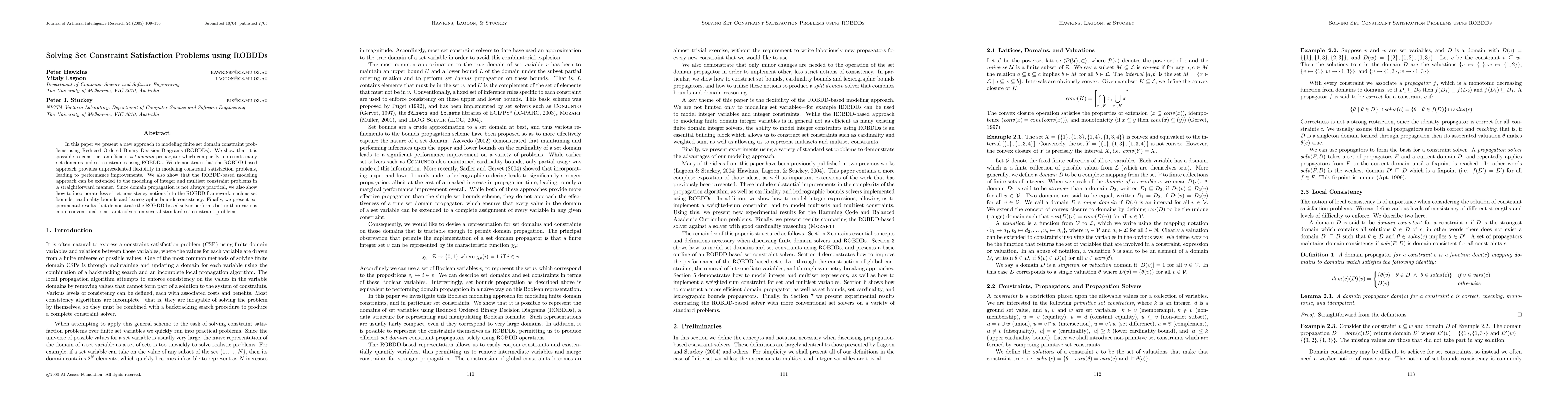 In this paper we present a new approach to modeling finite set domain constraint problems using Reduced Ordered Binary Decision Diagrams (ROBDDs). We show that it is possible to construct an efficient set domain propagator which compactly represents many set domains and set constraints using ROBDDs. We demonstrate that the ROBDD-based approach provides unprecedented flexibility in modeling constraint satisfaction problems, leading to performance improvements. We also show that the ROBDD-based modeling approach can be extended to the modeling of integer and multiset constraint problems in a straightforward manner. Since domain propagation is not always practical, we also show how to incorporate less strict consistency notions into the ROBDD framework, such as set bounds, cardinality bounds and lexicographic bounds consistency. Finally, we present experimental results that demonstrate the ROBDD-based solver performs better than various more conventional constraint solvers on several standard set constraint problems.