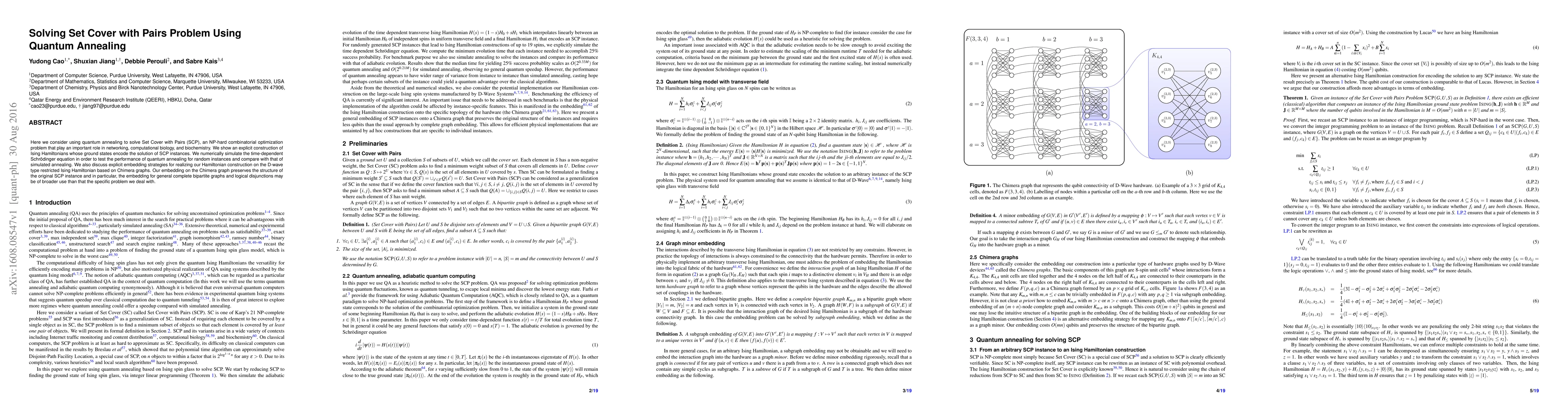 This paper explores the application of quantum annealing to solve the Set Cover with Pairs (SCP) problem using Ising Hamiltonians, demonstrating its effectiveness through numerical simulations compared to simulated annealing. It also discusses embedding strategies for D-wave systems, highlighting the broader applicability of the proposed methods.