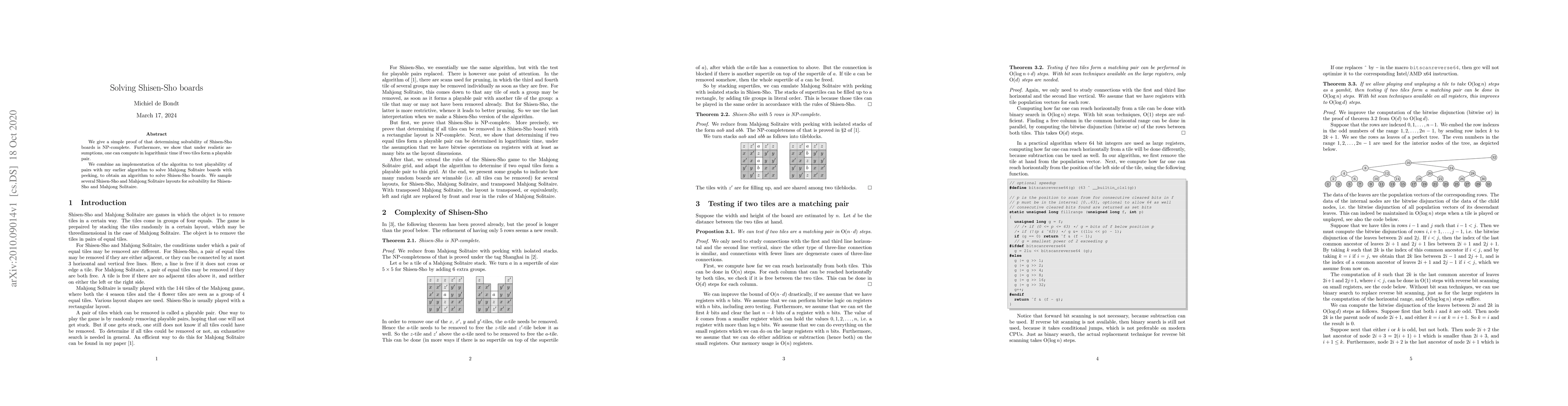 We give a simple proof of that determining solvability of Shisen-Sho boards is NP-complete. Furthermore, we show that under realistic assumptions, one can compute in logarithmic time if two tiles form a playable pair. We combine an implementation of the algoritm to test playability of pairs with my earlier algorithm to solve Mahjong Solitaire boards with peeking, to obtain an algorithm to solve Shisen-Sho boards. We sample several Shisen-Sho and Mahjong Solitaire layouts for solvability for Shisen-Sho and Mahjong Solitaire.