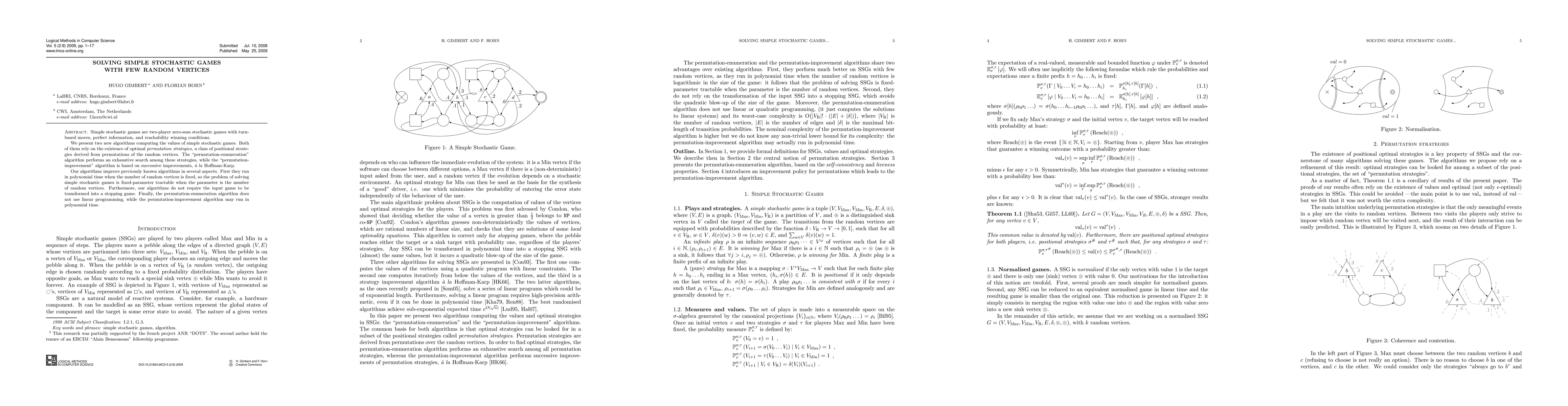 This paper introduces two new algorithms for solving simple stochastic games, relying on optimal permutation strategies derived from random vertices. The "permutation-enumeration" algorithm exhaustively searches these strategies, and the "permutation-improvement" algorithm iteratively improves them, both improving on previous methods by running in polynomial time when the number of random vertices is fixed.