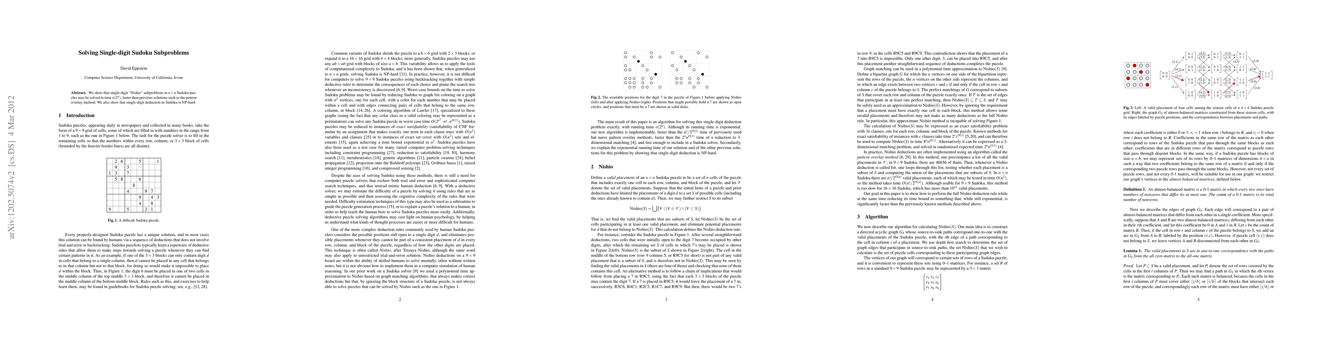 Summary: This paper presents a new method to solve single-digit "Nishio" subproblems in Sudoku puzzles in o(2^n) time, outperforming previous pattern overlay techniques. It also establishes the NP-hardness of single-digit deduction in Sudoku.