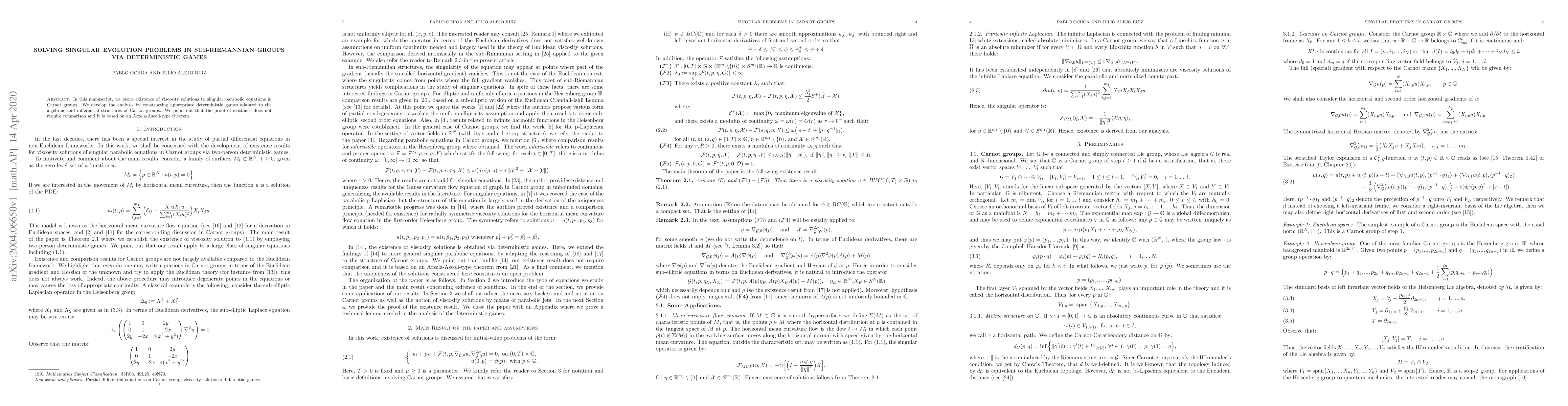 In this manuscript, we prove existence of viscosity solutions to singular parabolic equations in Carnot groups. We develop the analysis by constructing appropriate deterministic games adapted to the algebraic and differential structures of Carnot groups. We point out that the proof of existence does not require comparison and it is based on an Arzela-Ascoli-type theorem.
