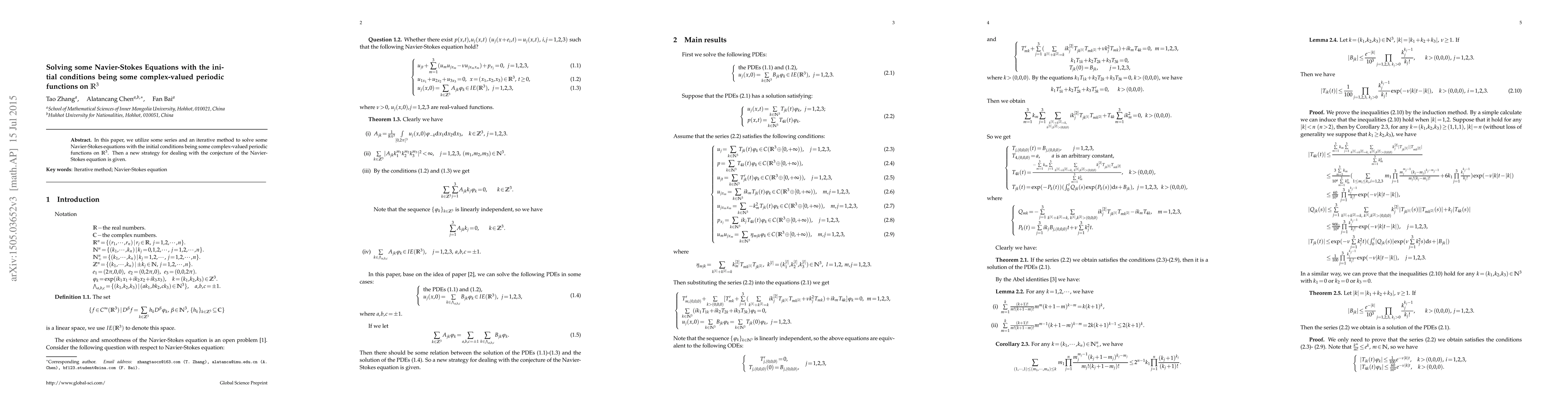 In this paper, we utilize some series and an iterative method to solve some Navier-Stokes equations with the initial conditions being some complex-valued periodic functions on $R^3$. Then a new strategy for dealing with the conjecture of the Navier-Stokes equation is given.