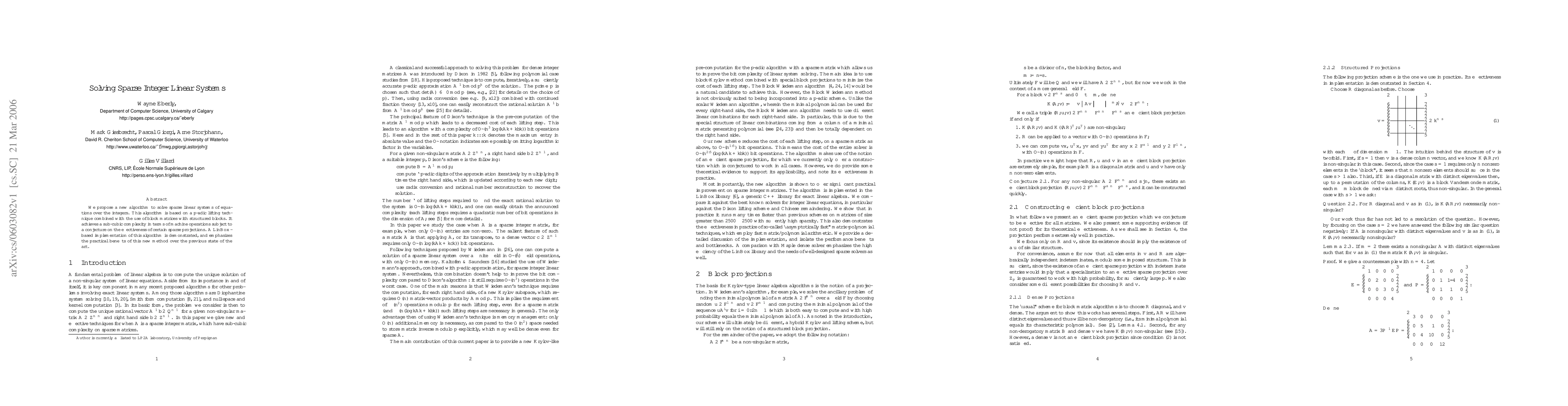 The research proposes a novel algorithm for solving sparse linear systems of equations over integers, utilizing a p-adic lifting technique and block matrices with structured blocks.