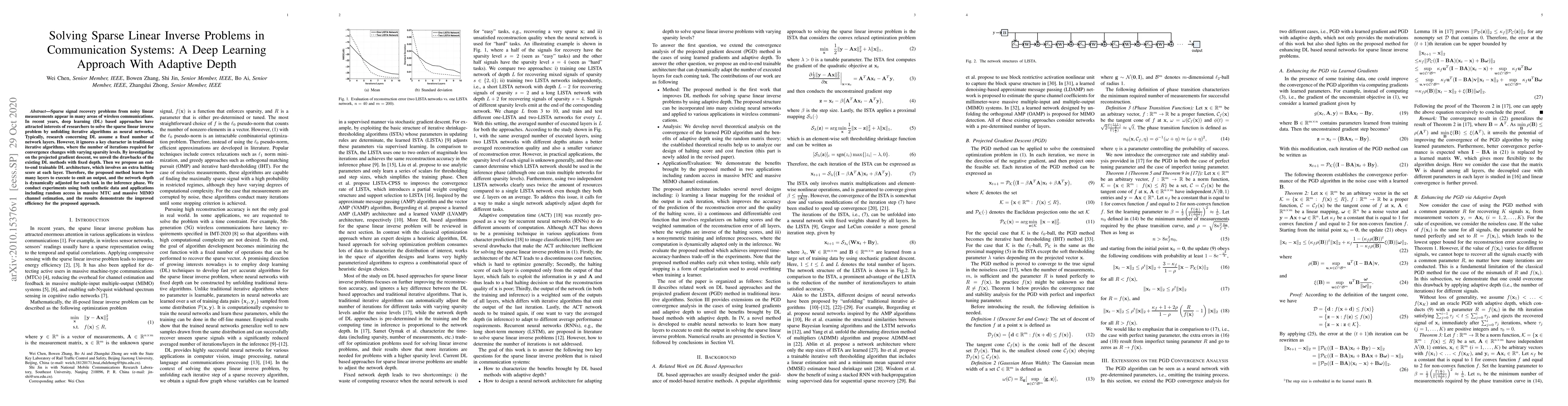 This paper proposes a deep learning approach for solving sparse linear inverse problems in communication systems, featuring adaptive network depth to dynamically adjust the number of layers based on the sparsity level. The method outperforms existing fixed-depth deep learning models, as demonstrated through experiments on synthetic data and real-world applications.