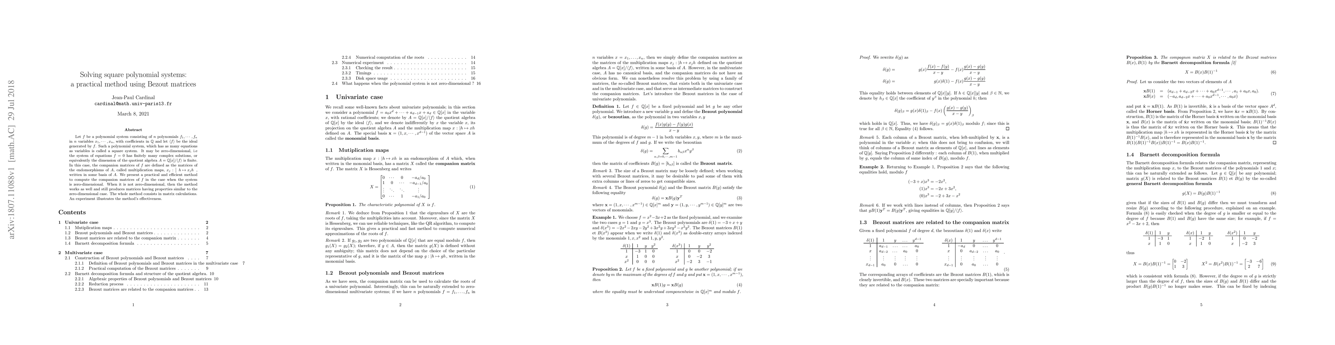 Let $f$ be a polynomial system consisting of $n$ polynomials $f_1,\cdots, f_n$ in $n$ variables $x_1,\cdots, x_n$, with coefficients in $\mathbb{Q}$ and let $\langle f\rangle$ be the ideal generated by $f$. Such a polynomial system, which has as many equations as variables is called a square system. It may be zero-dimensional, i.e the system of equations $f = 0$ has finitely many complex solutions, or equivalently the dimension of the quotient algebra $A = \mathbb{Q}[x]/\langle f\rangle$ is finite. In this case, the companion matrices of $f$ are defined as the matrices of the endomorphisms of $A$, called multiplication maps, $x_j : \left\vert \begin{array}{c} h \mapsto x_jh \end{array} \right.$, written in some basis of $A$. We present a practical and efficient method to compute the companion matrices of $f$ in the case when the system is zero-dimensional. When it is not zero-dimensional, then the method works as well and still produces matrices having properties similar to the zero-dimensional case. The whole method consists in matrix calculations. An experiment illustrates the method's effectiveness.