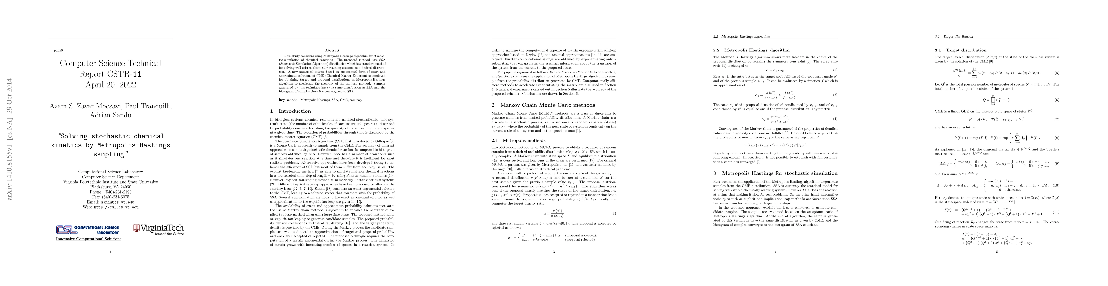 This paper proposes using the Metropolis-Hastings algorithm to simulate stochastic chemical kinetics, employing a new numerical solver based on the exponential form of the Chemical Master Equation to enhance the accuracy of the tau-leap method. The method demonstrates convergence to the standard Stochastic Simulation Algorithm (SSA) distribution.