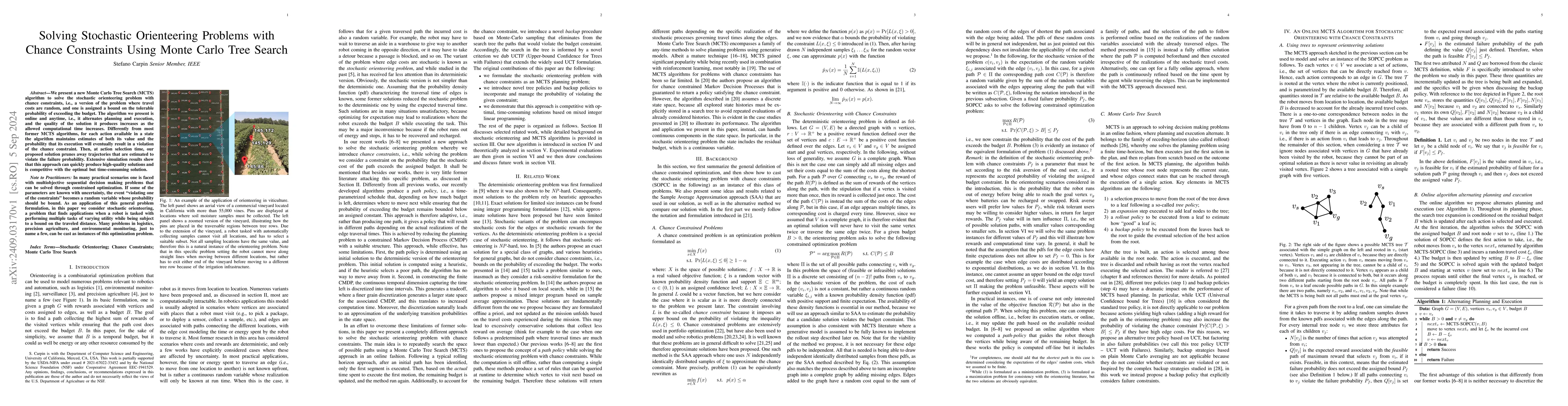 This paper introduces an online Monte Carlo Tree Search (MCTS) algorithm for solving stochastic orienteering problems with chance constraints, improving solution quality over time by pruning paths likely to violate budget constraints. Simulation results demonstrate its effectiveness in producing competitive solutions efficiently.