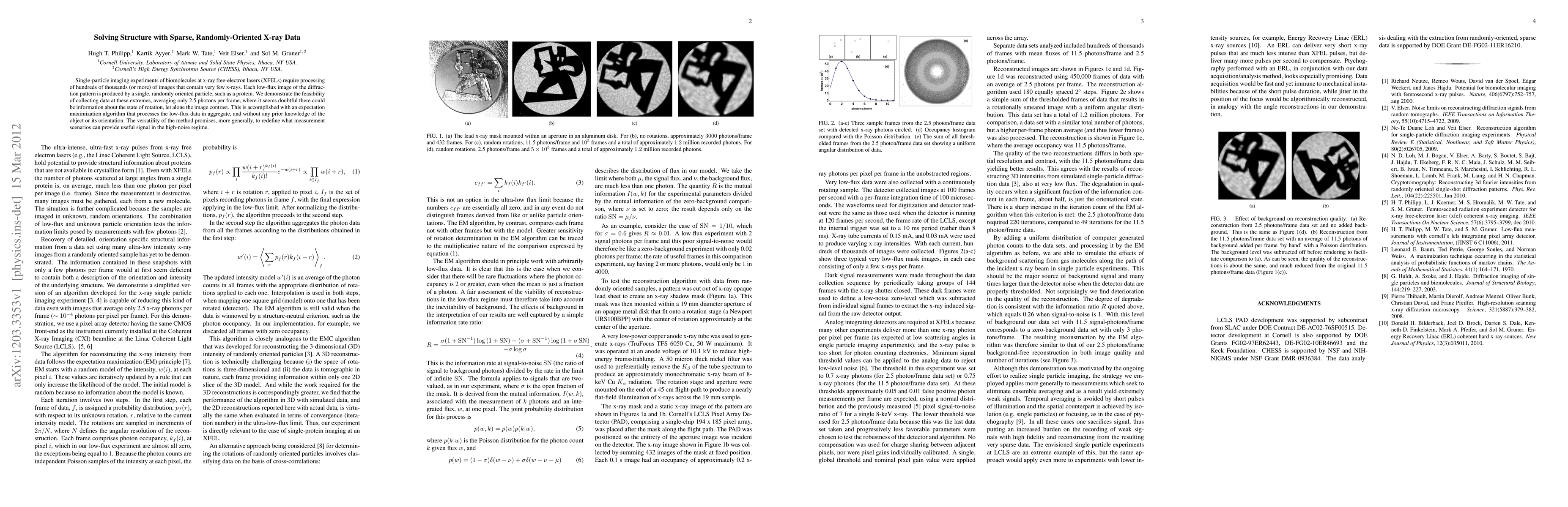 This paper presents an expectation maximization algorithm to reconstruct biomolecular structures from sparse, randomly-oriented X-ray diffraction patterns collected at XFELs, demonstrating feasibility with an average of just 2.5 photons per frame. The method processes low-flux data without prior knowledge, promising to redefine useful signal extraction in high-noise regimes.