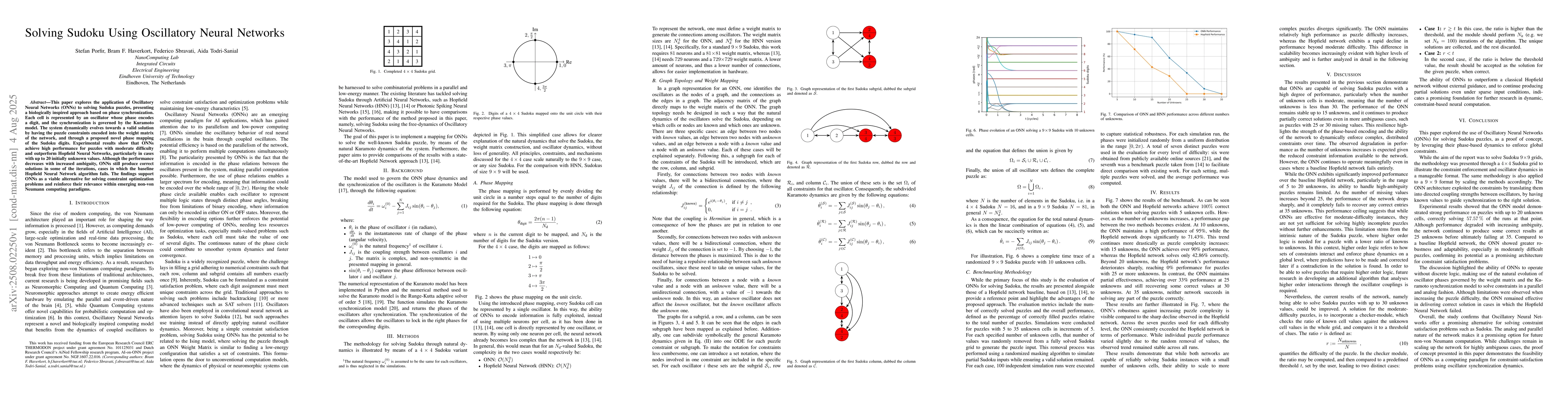 This paper explores the application of Oscillatory Neural Networks (ONNs) to solving Sudoku puzzles, presenting a biologically inspired approach based on phase synchronization. Each cell is represented by an oscillator whose phase encodes a digit, and the synchronization is governed by the Kuramoto model. The system dynamically evolves towards a valid solution by having the puzzle constraints encoded into the weight matrix of the network, and through a proposed novel phase mapping of the Sudoku digits. Experimental results show that ONNs achieve high performance for puzzles with moderate difficulty and outperform Hopfield Neural Networks, particularly in cases with up to 20 initially unknown values. Although the performance decreases with increased ambiguity, ONNs still produce correct solutions in some of the iterations, cases in which the baseline Hopfield Neural Network algorithm fails. The findings support ONNs as a viable alternative for solving constraint optimization problems and reinforce their relevance within emerging non-von Neumann computing paradigms.
