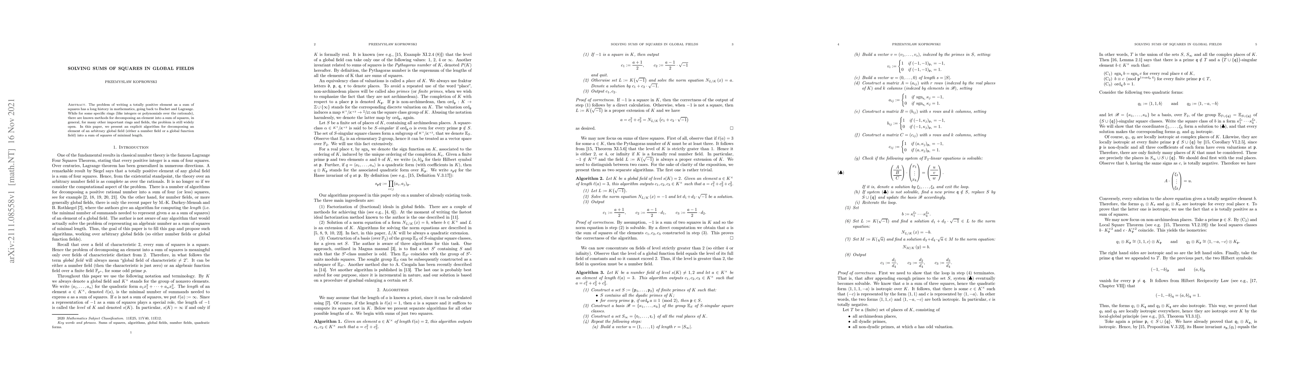 Researchers have developed an algorithm to decompose elements in arbitrary global fields into a sum of squares with minimal length, solving a long-standing problem in mathematics.