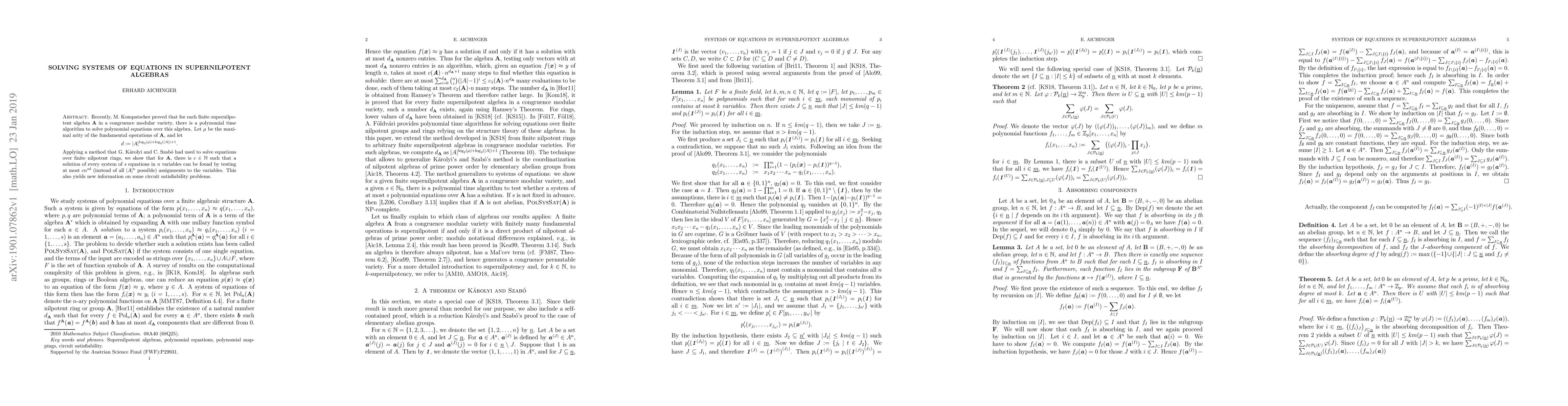 The paper presents a polynomial time algorithm for solving systems of polynomial equations in finite supernilpotent algebras, improving upon brute force methods by reducing the number of variable assignments tested. This advancement leverages prior techniques for finite nilpotent rings and extends insights to circuit satisfiability problems.