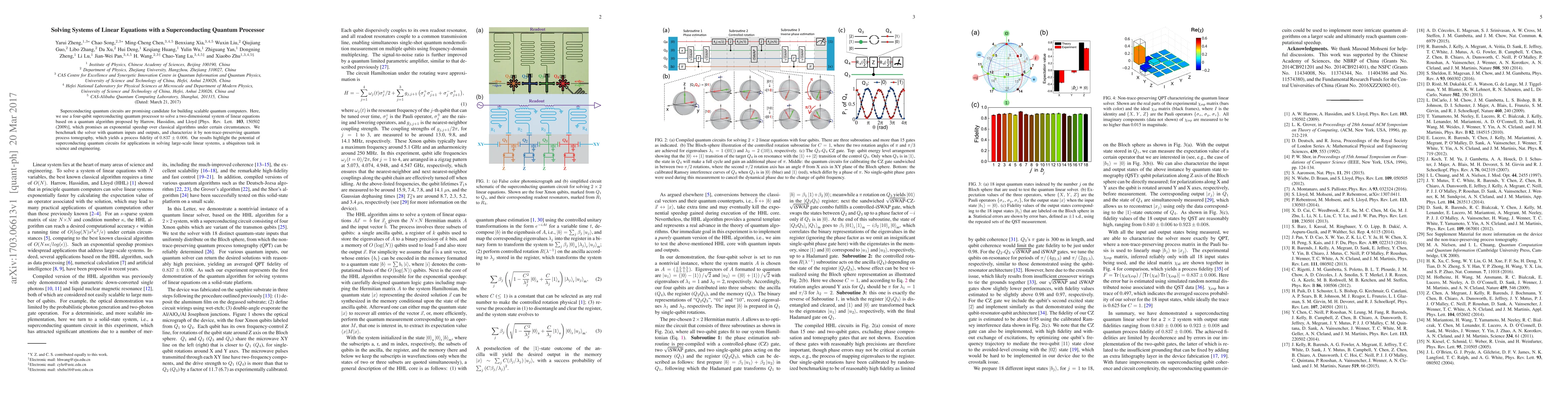 This paper demonstrates the use of a four-qubit superconducting quantum processor to solve a two-dimensional system of linear equations using a quantum algorithm that could offer exponential speedup over classical methods. The processor achieves a process fidelity of 0.837±0.006, showcasing the potential of superconducting quantum circuits for tackling large-scale linear systems.